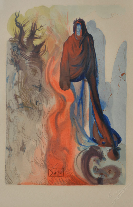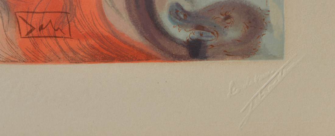 SALVADOR DALI DIVINE COMEDY WOOD ENGRAVING HELL CANTO #16: Sight size 13'' x 10.25'', signed in the plate lower mid-margin, blind stamp lower right, framed, 27'' x 25''.