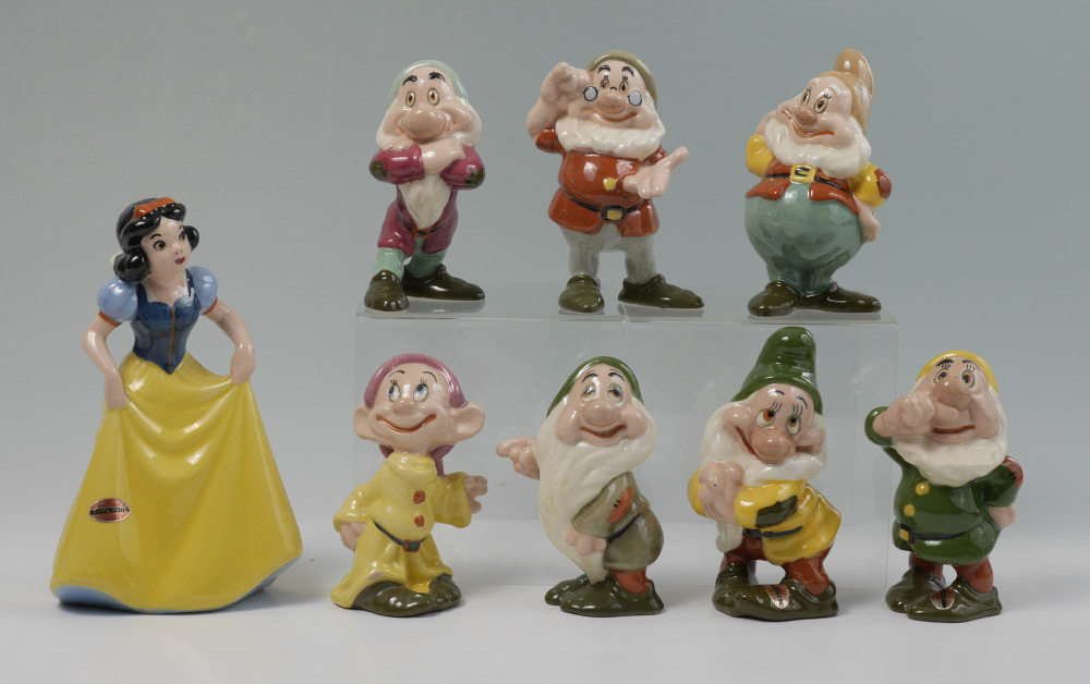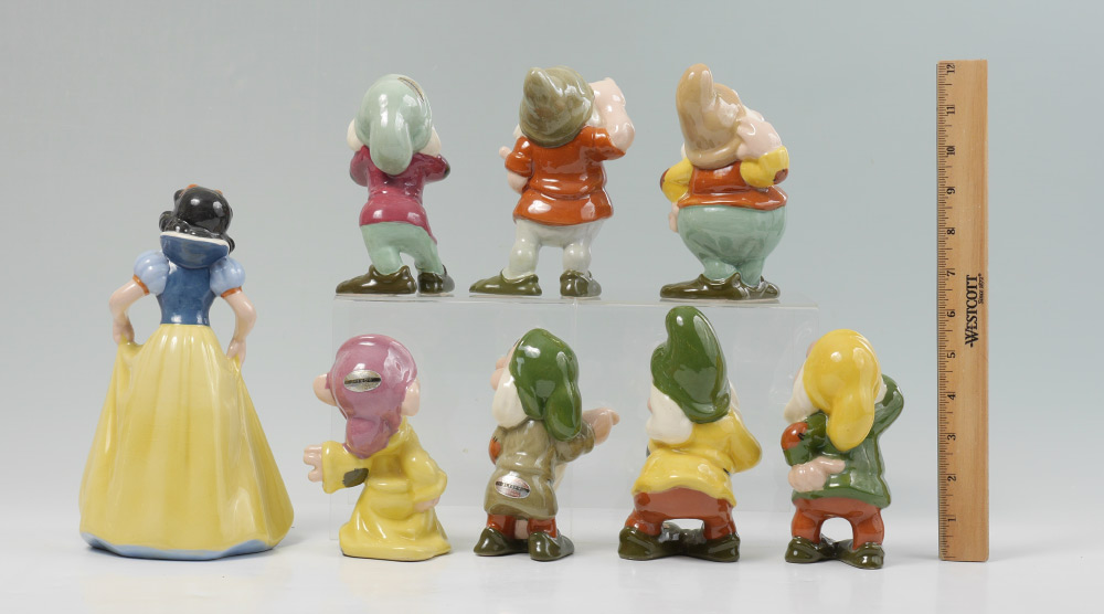 COMPLETE SHAW POTTERY SNOW WHITE AND THE SEVEN DWARFS SET: Complete set, 8 pieces total by Evan K. Shaw / American Pottery Co., most with original labels. Snow White measures 8 3/4'' h. x 5 1/2'' x 4''.