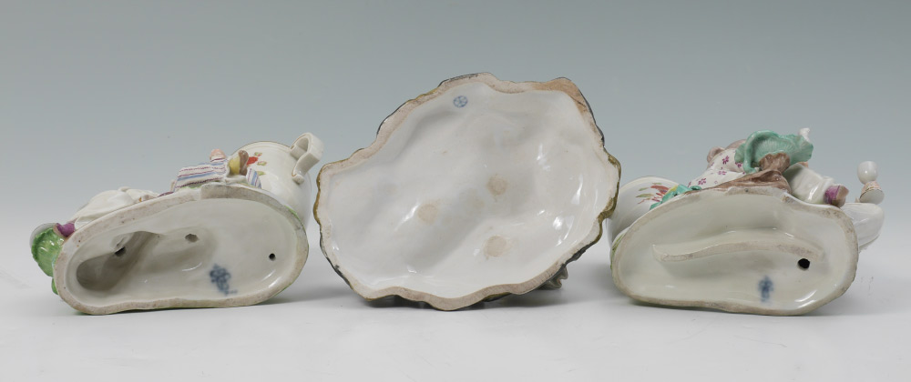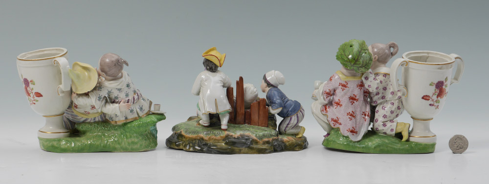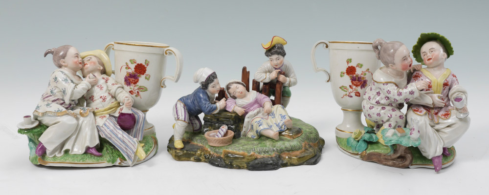 3 GERMAN PORCELAIN FIGURAL GROUPS: 3 pieces total to include 1) Frankenthal marked with figures of oriental girl and boy drinking wine, urn form spill vase, hazy blue mark. 5'' h. x 7 1/2'' x 4 1/4''. 2) Similar, but not identical spill vase. 3) Dressel, Kister & Cie group of 2 boys and sleeping girl, spoked wheel blue mark, 5'' h. x 7 1/4'' x 6''.