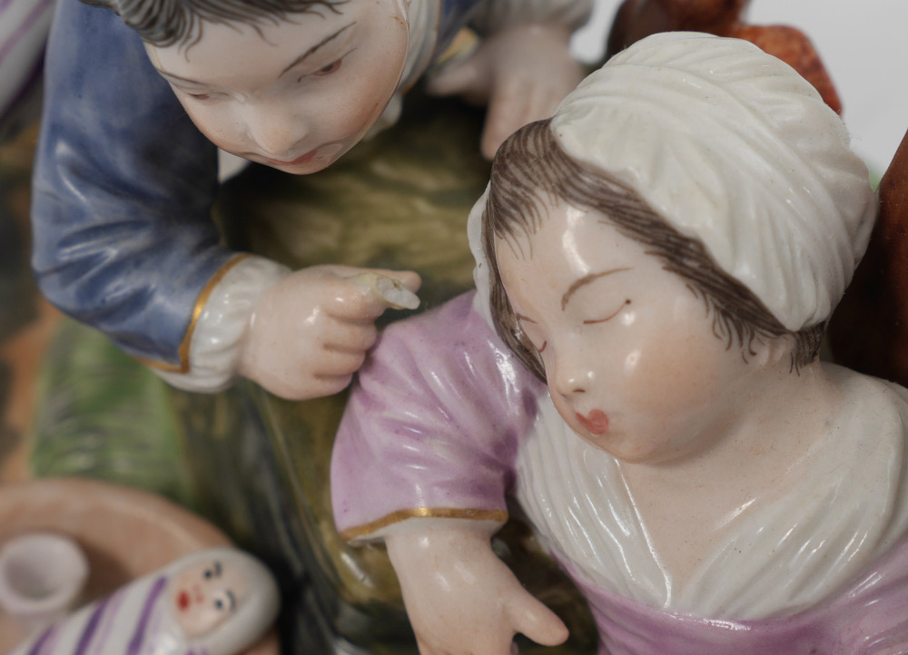 CONDITION: 1) Glaze cracks inside cups. 2) Chips to boy's hat, chip repair on base.