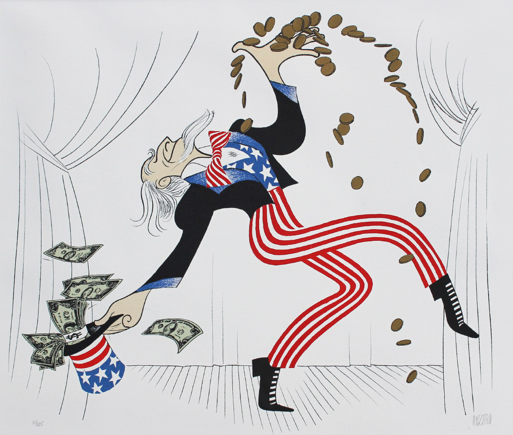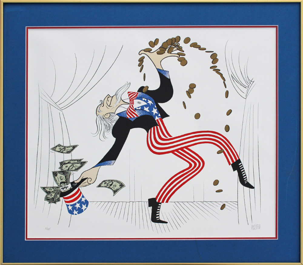 HIRSCHFELD, Albert (American, 1903-2003): Uncle Sam, Lithograph, sight size 17.5'' x 21'', pencil signed lower right, numbered 10/125 lower left, framed, 22.25'' x 25.75''. ''Albert Hirschfeld became famous for his personality caricatures of theater people, pen and ink work he did in his position as Theatre Caricaturist for The New York Times. He earned 23 awards including in 1984 a special Tony Award, which was a sign that the theater world welcomed him as one of their own. His work also appeared in other newspapers and books, and in 1996, a film documentary of his life titled The Line King, was nominated for an Academy Award. That same year Hirschfeld was named one of six New York City Landmarks by the New York Landmarks Conservancy.'' Excerpt from ASKART Dec 1, 2016.