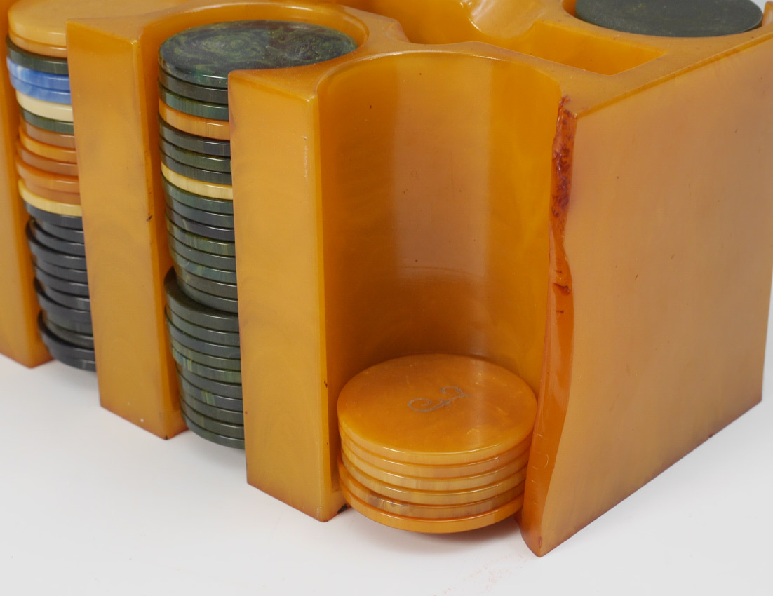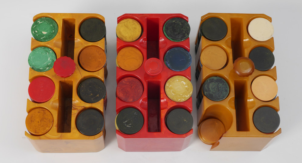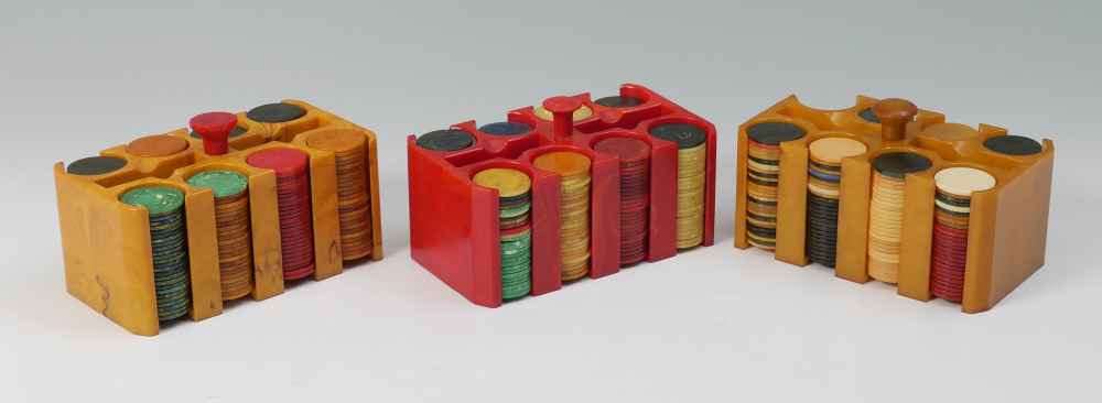 3 BAKELITE POKER CHIP HOLDERS AND CHIPS: 3 chip caddies total, 2 yellow and 1 red, sold with and assortment of Bakelite chips. Holders measure 4 1/2'' h. x 7 1/2'' x 4 1/4''.