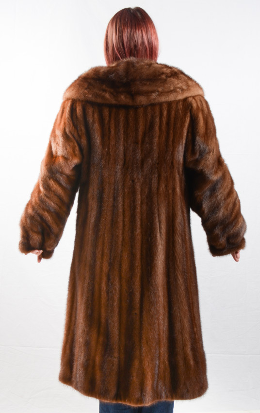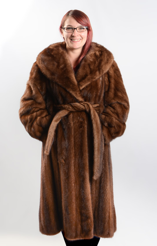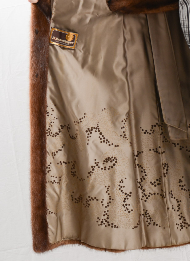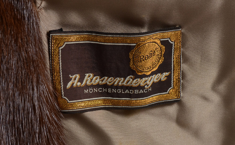 FULL LENGTH MINK COAT: Beautiful mink coat has a very generous stand up collar and a label in the lining ''A Rosenberger, Monchengladbach''. 3 snap / hook closures and a mink belt. Approximate measurements shoulder to sleeve 27'', shoulder to shoulder 17'' and shoulder to hem 46''. Very good condition.