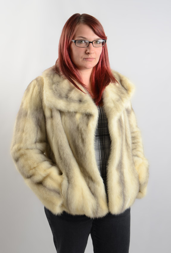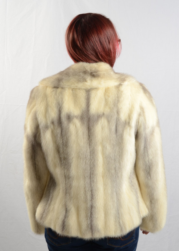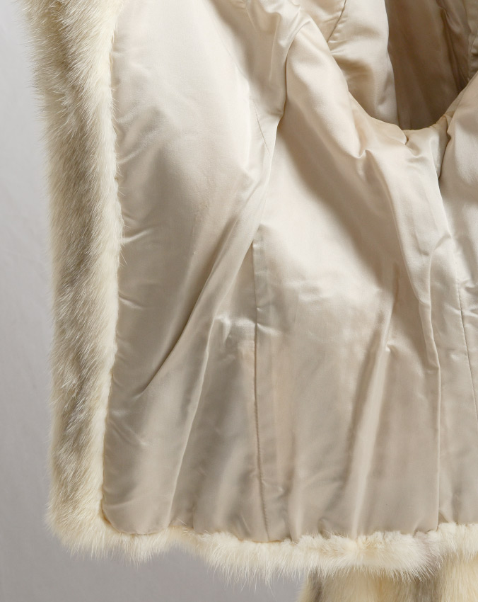 WHITE CREAM PEARL NATURAL MINK FUR JACKET: This jacket features a double-sided fur wing collar, lined pockets and a single hook closure. The fur and the lining are in excellent condition with some minor re-stitching needed at the back collar. Approximate measurements 24'' from shoulder to cuff, 15'' from shoulder to shoulder and 25'' from shoulder to hem.