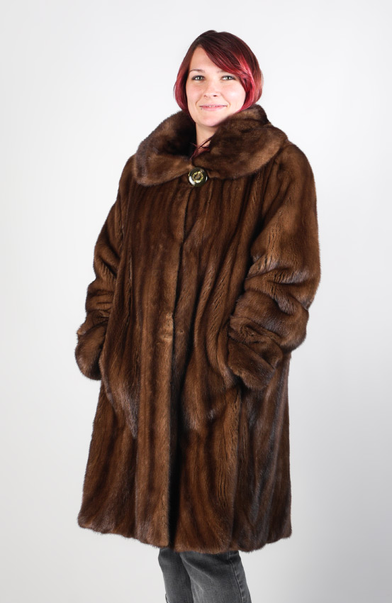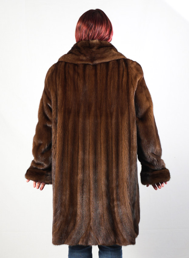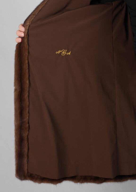 LUXURIOUS NATURAL DARK BROWN MINK FUR STROLLER: Purchased in 2005, this gorgeous stroller has been in cold storage when not in use and is in excellent condition. It has a lovely stand up collar, single button closure at the neck and 3 hooks to close the front on those chilly evenings. Originally purchased for $3100 in 2005; original receipts are available. Approximate measurements 26'' from shoulder to cuff, 18'' from shoulder to shoulder and 38'' from shoulder to hem.