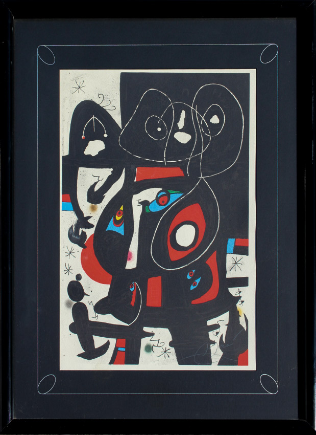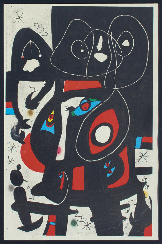 JOAN MIRO LITHOGRAPH: Sight size 24.25'' x 17.5'', plate signed lower right, black lacquer frame, 35'' x 28''.