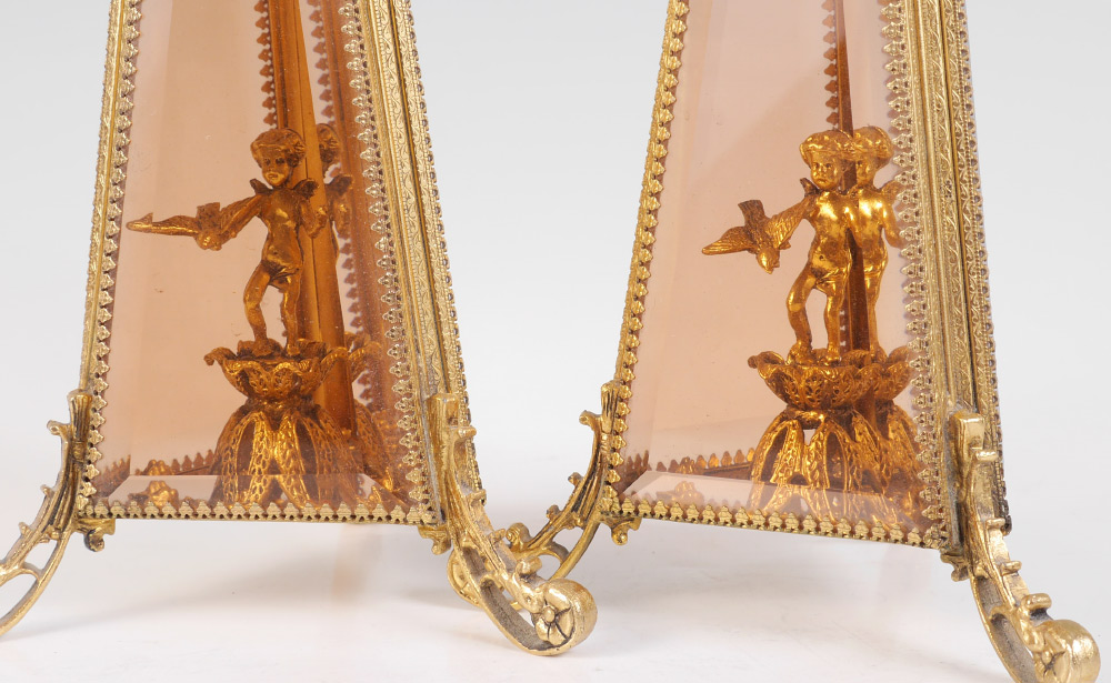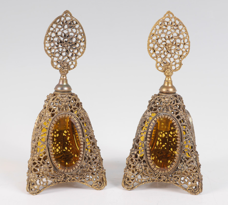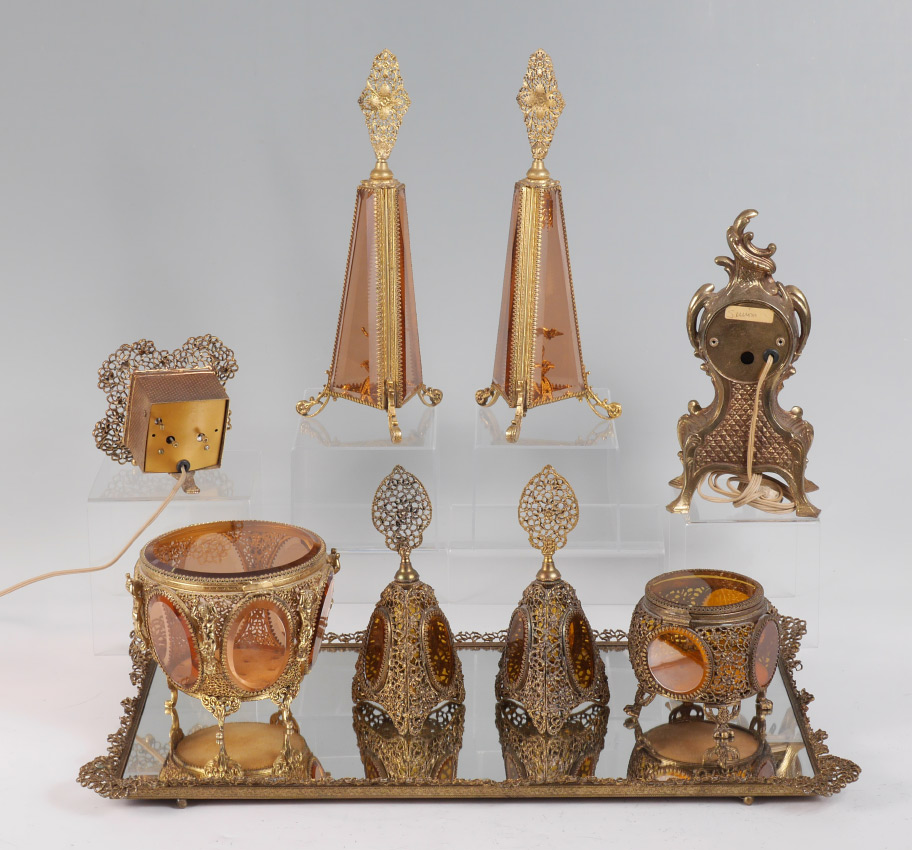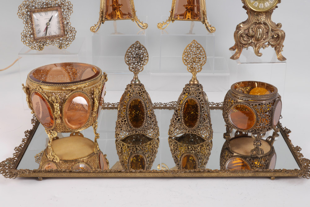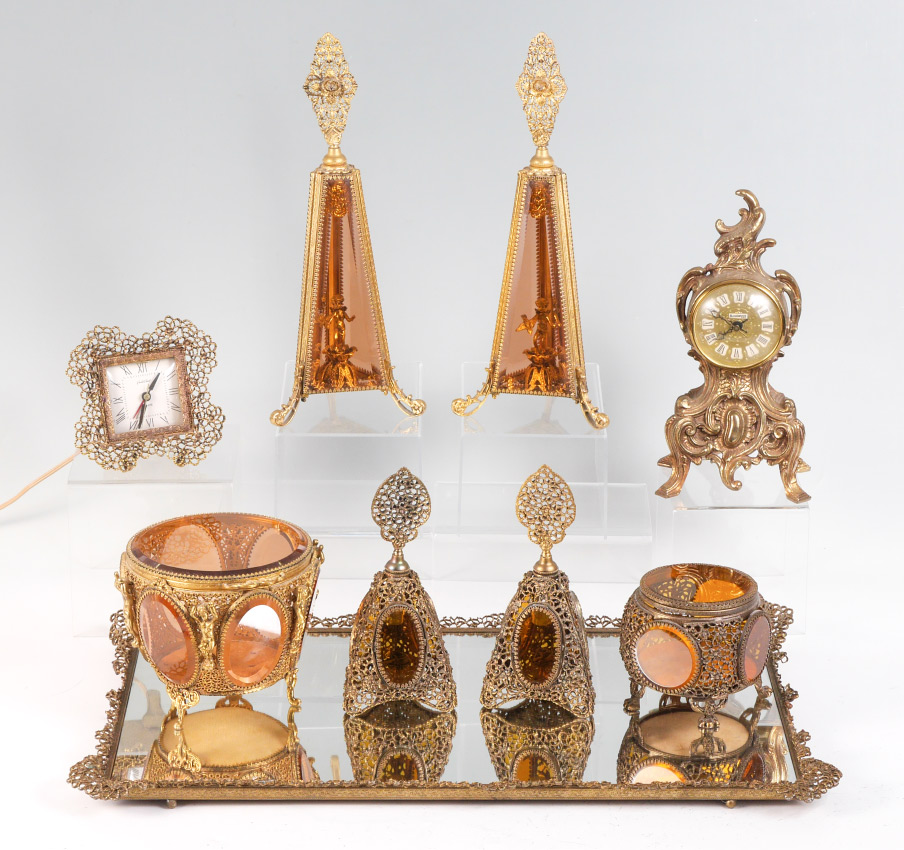 GILT METAL FILIGREE DRESSER SET: An assembled collection of gilt metal filigree items for the dresser to include 1-2) Pair perfume bottles with 3 beveled pink glass sides, figural putti and birds inside. 14'' h. x 5 1/4''. 3-4) Pair perfume bottles. 3 sides with amber glass medallions, figural rose inside, 9'' h. x 4''. 5) Dresser box with beveled pink glass lid, pink glass side medallions and figural putti, 6'' h. x 7 1/2''. 6) Dresser box with hinged amber glass lid, amber sides, paw feet. 4 1/2'' h. 7-8) 2 separate electric desk clocks. Tallest 11 1/4''. 9) Mirrored tray, 25 1/2'' x 15''.