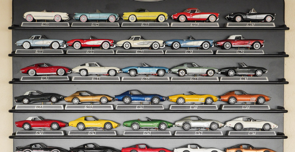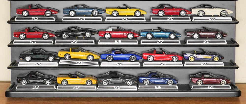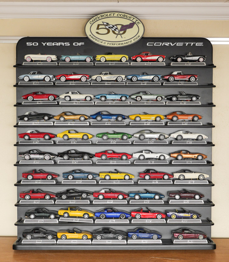 DANBURY MINT 50 YEARS OF CORVETTE SET: Complete collection of 1/43 scale Corvettes from 1953-2003 with display rack from the Danbury Mint. Rack measures 27 '' h. x 43'' x 3''.