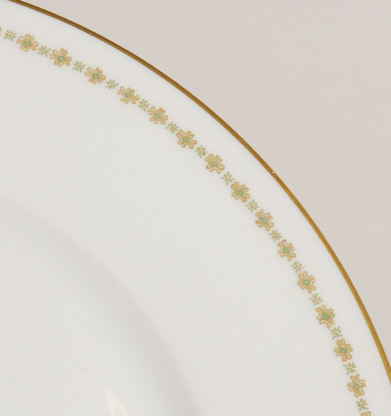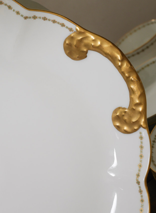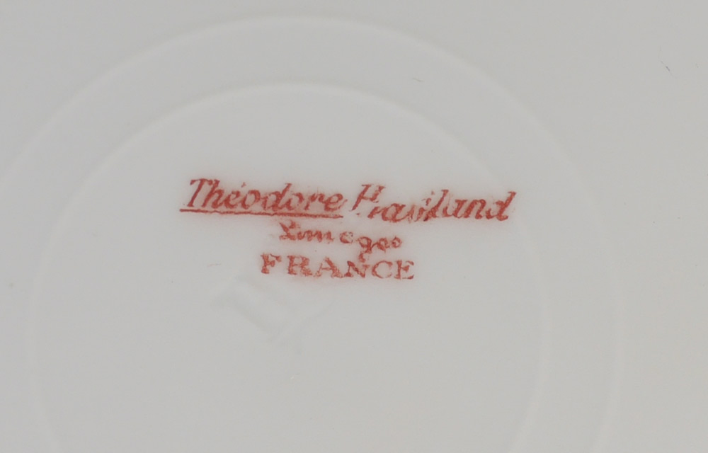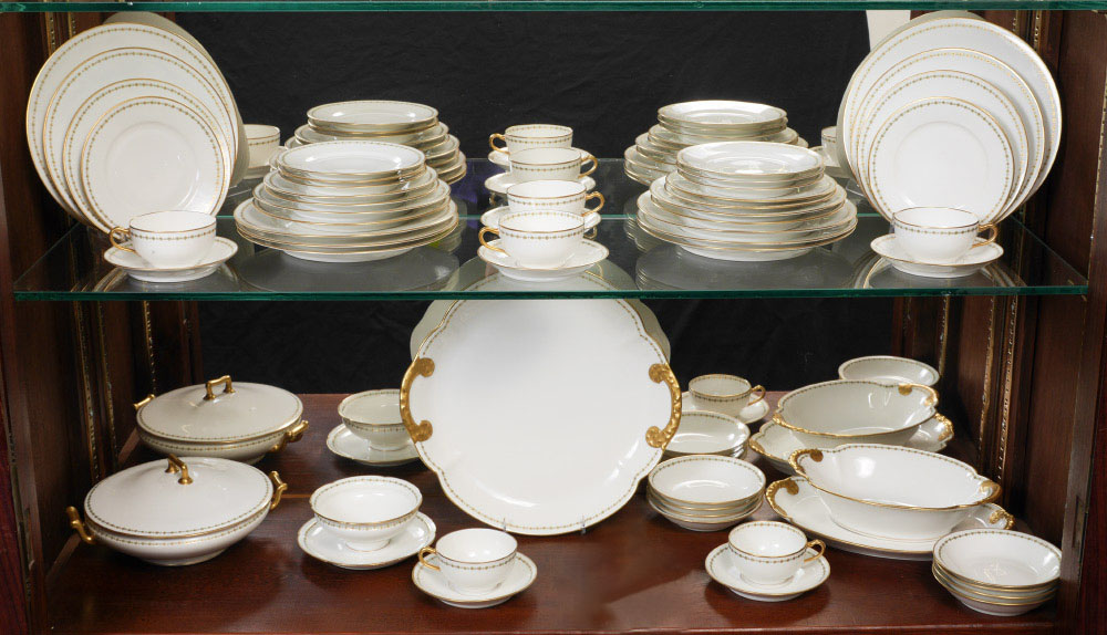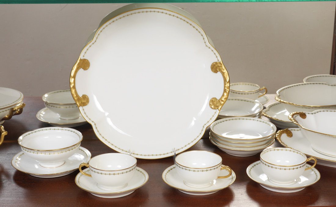 COLLECTION OF HAVILAND LIMOGES CHINA: Approx. 52 pieces total by Theodore Haviland, Limoges, with a floral and gilt border to include 7 dinner plates (9 3/4''), 6 salad plates, 6 luncheon plates, 8 bread plates, 8 bowls, 6 teacups & saucers, 2 platters (larger 12 1/2'' round), covered vegetable (8''), oval open vegetable (10''), gravy.