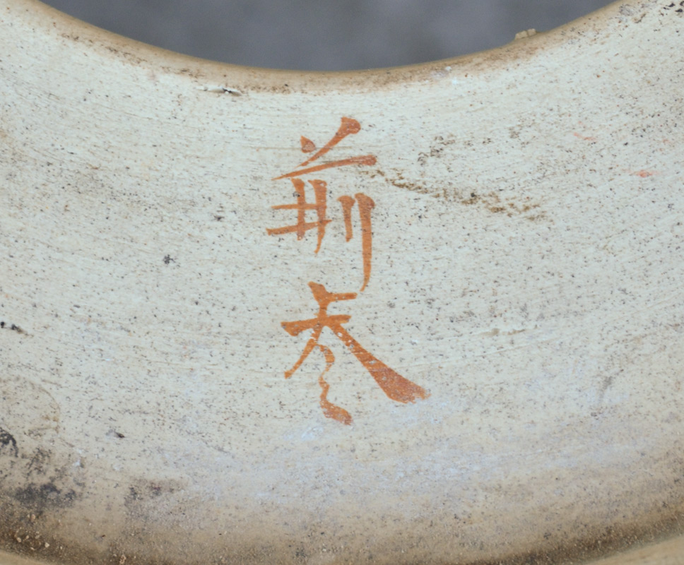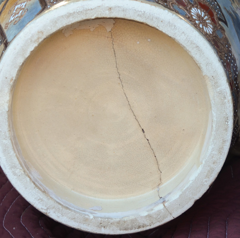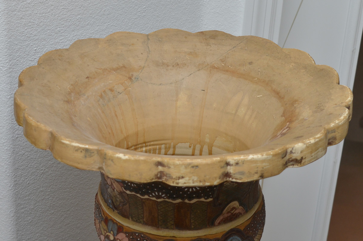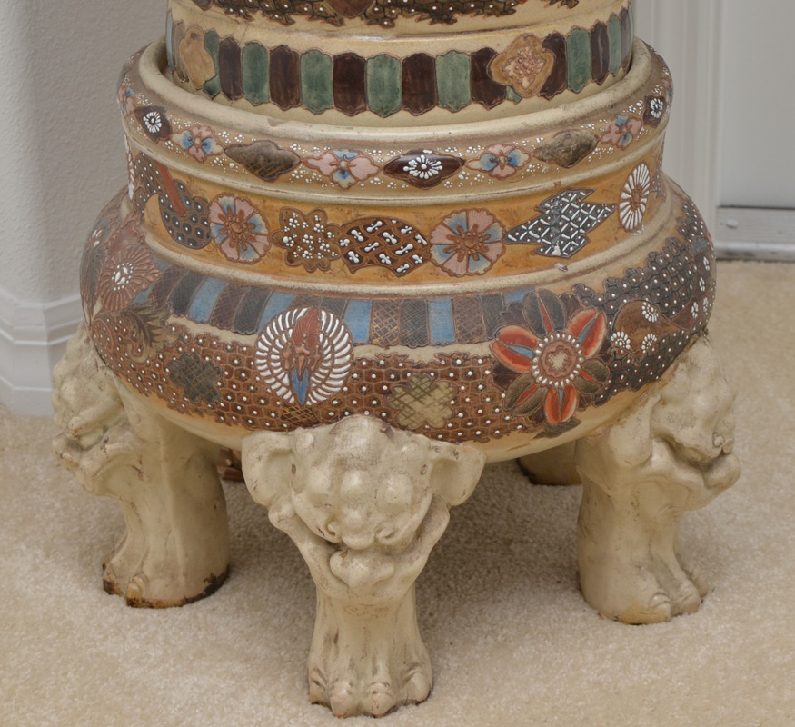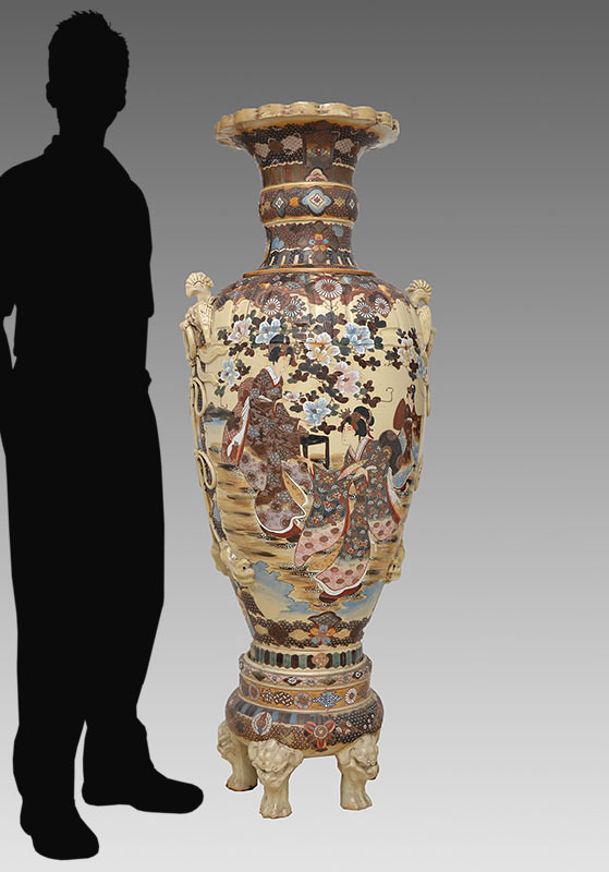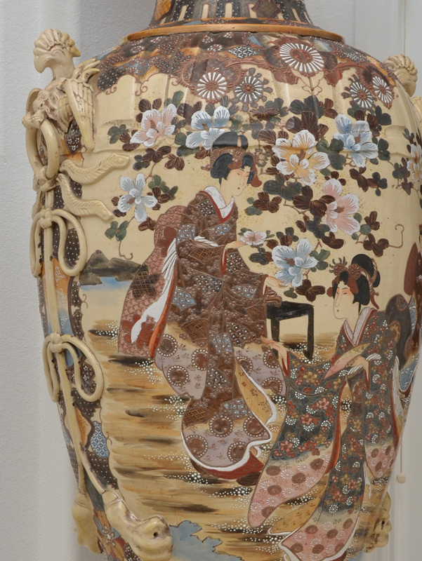 MONUMENTAL JAPANESE SATSUMA MEIJI PERIOD VASE ON STAND: Lotus-form rim and neck are molded over a shaped ovoid body flanked by applied winged birds with talons each clutching a ring suspended with knotted rope terminating in tassels. This phenomenal palace vase is painted in high detail with scenes of geishas within coastal gardens, the reverse side painted with a multiple battle scene vignettes of Japanese warriors in minute detail as well. Vase sits raised on matching squat pedestal with grotesque masks on each leg. 60 1/2'' h. x 24''.
