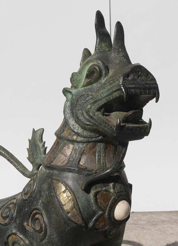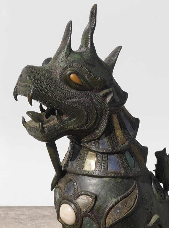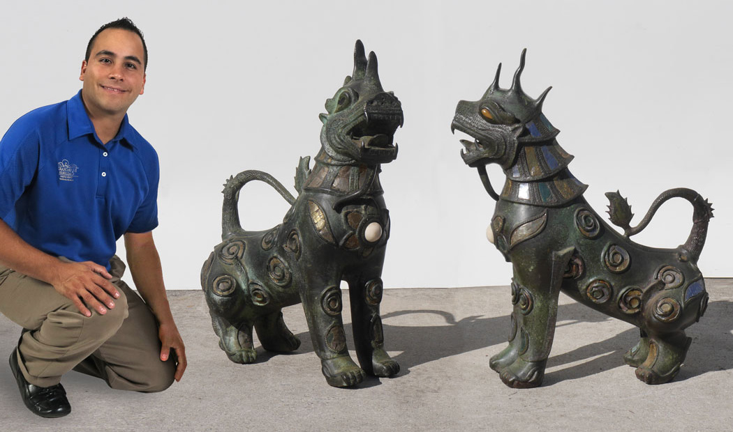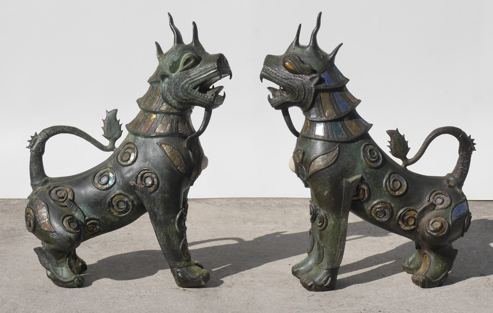 PAIR LARGE BRONZE TIBETAN TEMPLE LIONS: Nearly identical pair with open mouths, inset stone and mica decoration on patinated bronze and metal bodies. 33'' h. x 27'' x 13''.