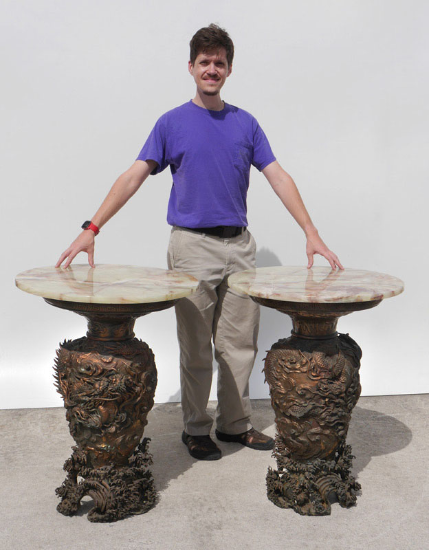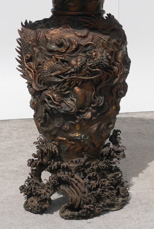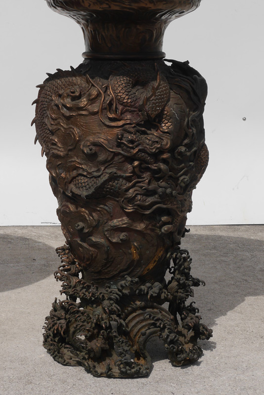 PAIR BRONZE PALACE VASES WITH ONYX TOPS: High relief Japanese bronze figural dragon motif palace vases, baluster form with flared rim and open work base. Measures 32 1/2'' h. x 20''. Sol with 25'' dia. onyx top to convert to stands.