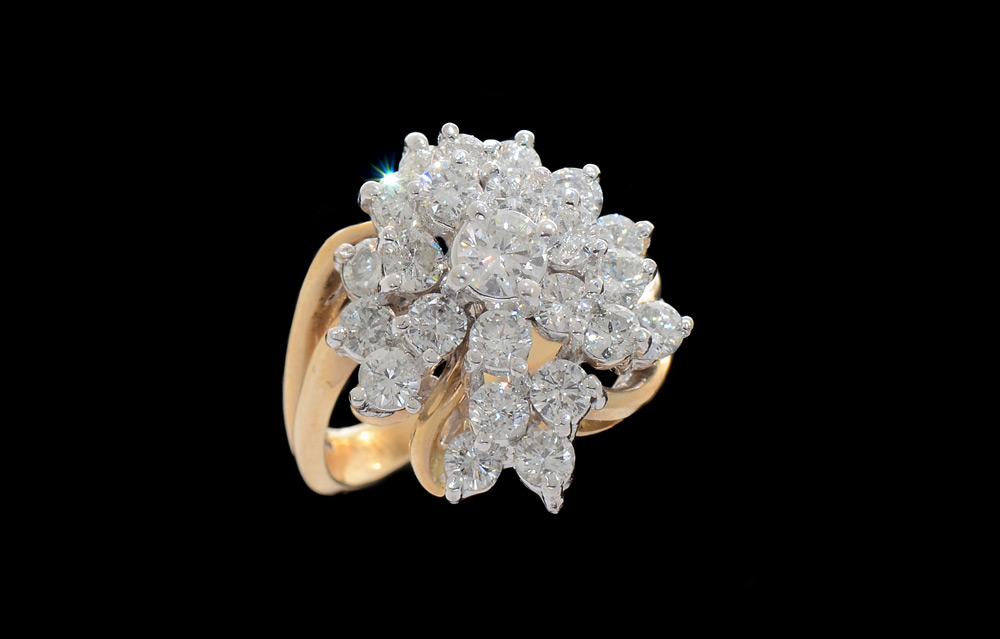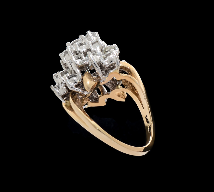 DIAMOND PRINCESS RING: 14K yellow gold ring, at the center is a round brilliant cut diamond approx .33 Ct., rated VS2 in clarity and G-H in color. It is resting on a bed of 23 round brilliant cut diamonds totaling approx 3.58 Ct., rated VS-SI in clarity and G-H in color. TOTAL diamond weight is 2.91 Ct. Weight is 11.9 grams and the ring size is 7. Sold with current Florida Diamond Appraisers GIA graduates appraisal for $7,650.