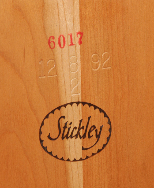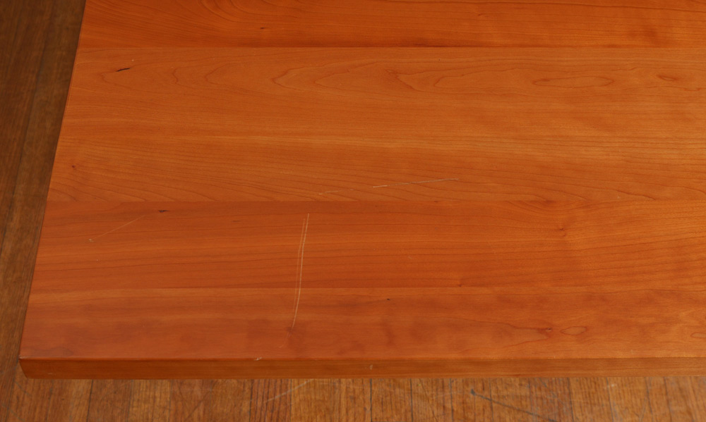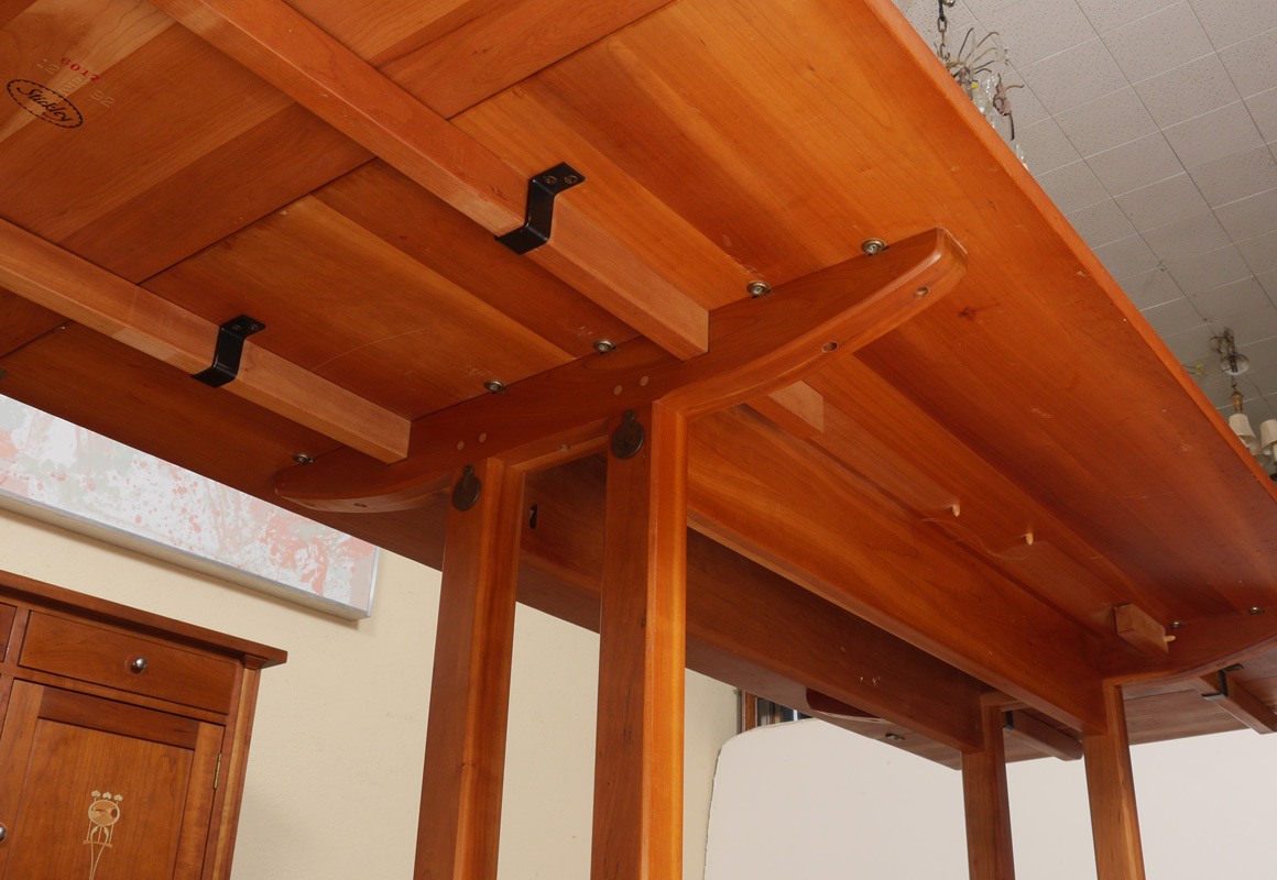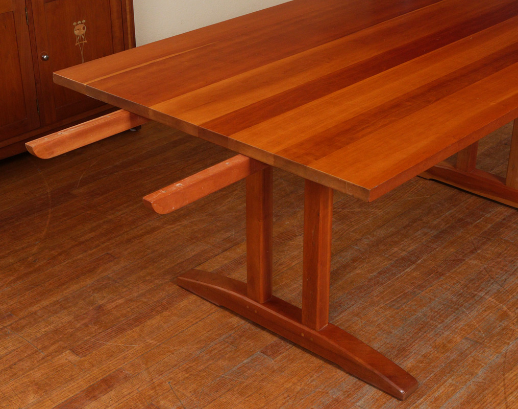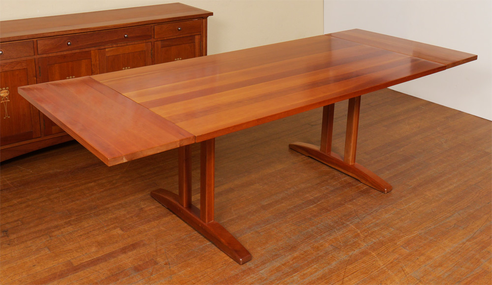 STICKLEY CHERRY TRESTLE DINING TABLE: Contemporary Stickley table with trestle style base, drop leaf at either end. Measures 30 1/2'' h. x 74'', 40'', each drop leaf adds 15''.