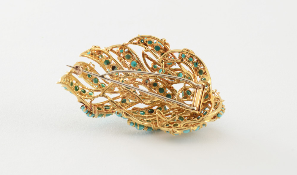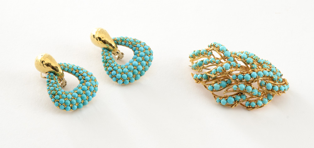 STUNNING 18K TURQUOISE BROOCH AND EARRINGS: 18K yellow gold brooch and earrings contain round cabochon cut pieces of turquoise . Brooch measures 2.25'', with bar pin closure. The earrings are 1.5'' x 1.25'', post with hinged clips. Mounting weight: 48.6 grams approx.