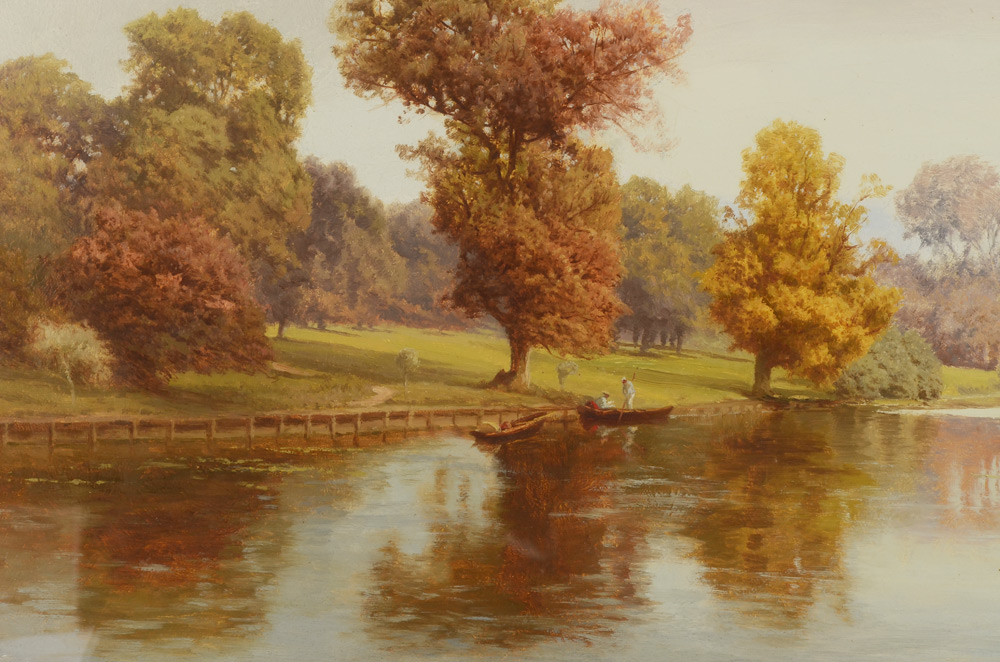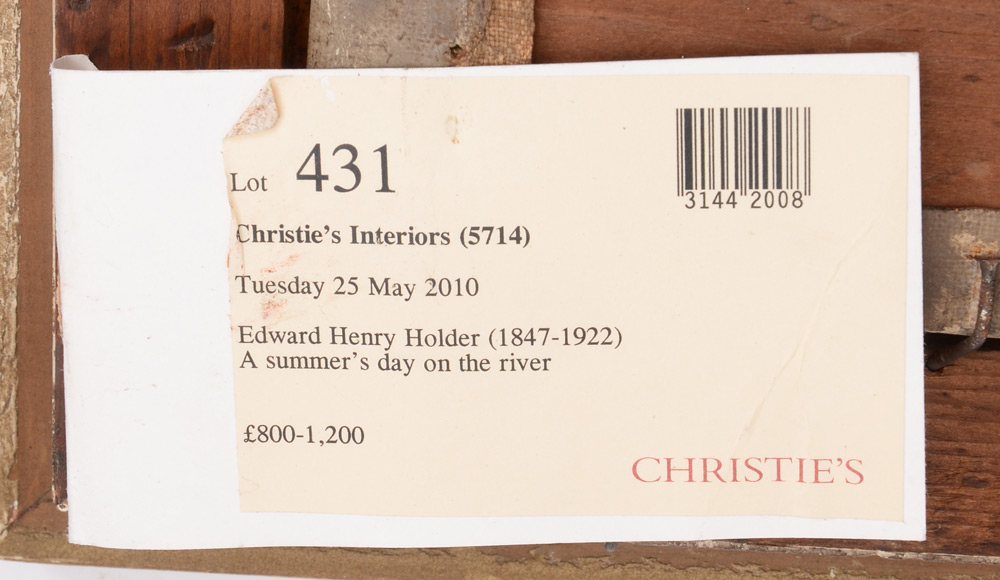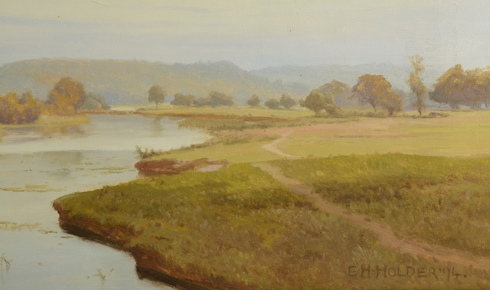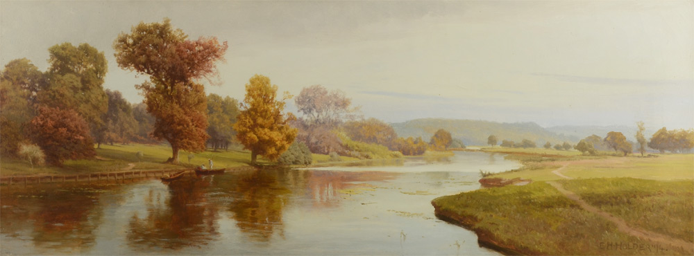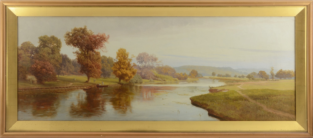 HOLDER, E. H., (British, 1847-1922): Panoramic Scene with Several Figures in Boats on A Lazy River, Oil/Canvas under glass, 13'' x 34'', Christie's label verso reads ''Summer's Day on The River'', signed lower right and dated '94, framed under glass 16.5'' x 37.5''.