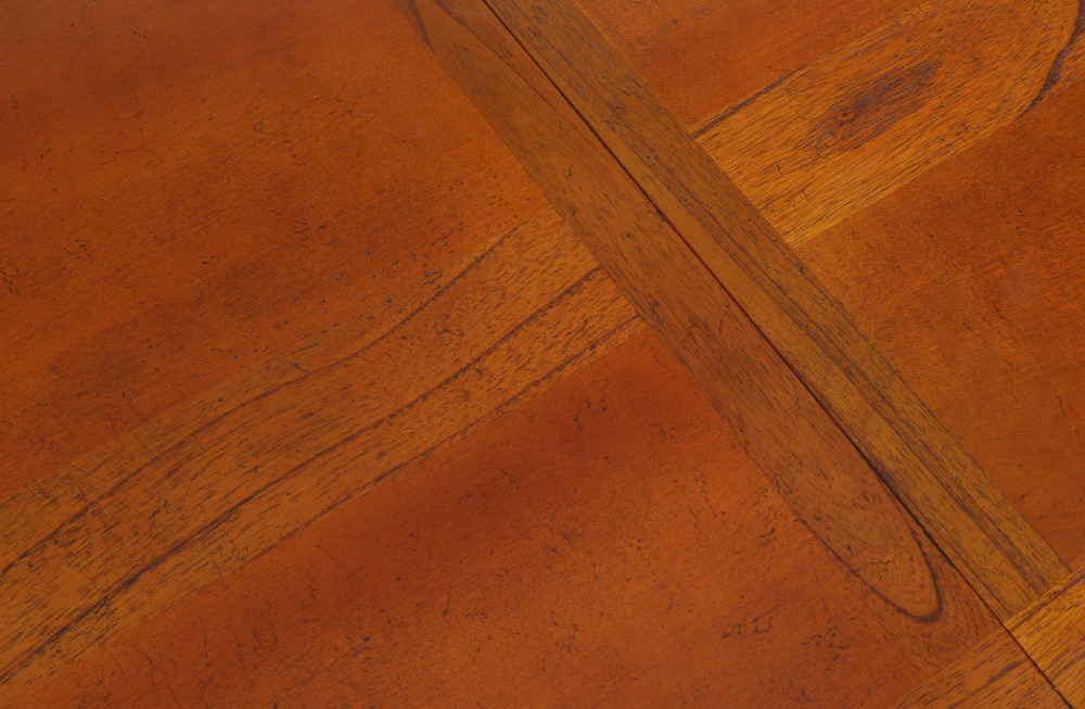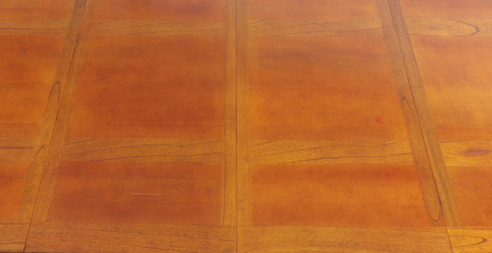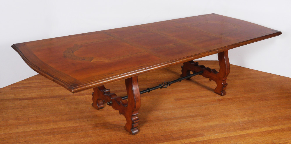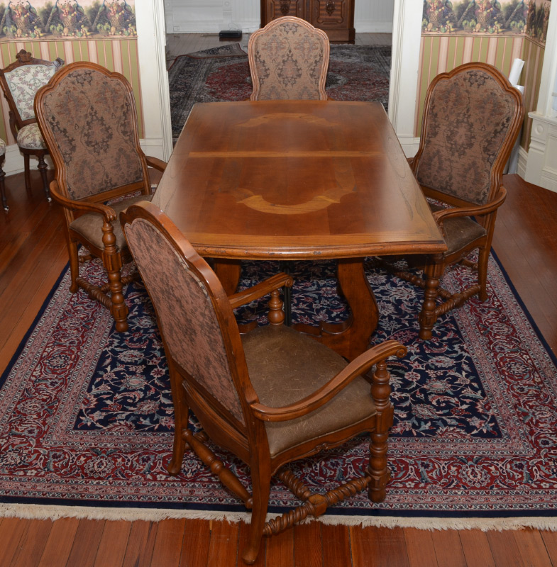 COUNTRY FRENCH STYLE DINING TABLE & 4 CHAIRS: From the Historic Bailey House in Fernandina Beach, FL. Rectangular top table with shaped ends, double harp pedestal bases with decorative metal stretcher, 30 3/4'' h. x 80 1/2'' x 43 1/4'', the two leaves measure 20''. Sold with 4 carved arm chairs with upholstered backs and leather seats, 45'' h. x 25 3/4'' x 26 1/2''.