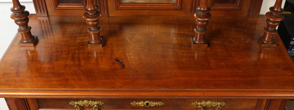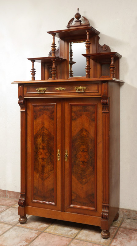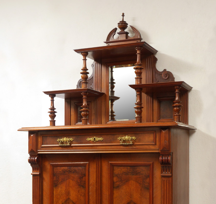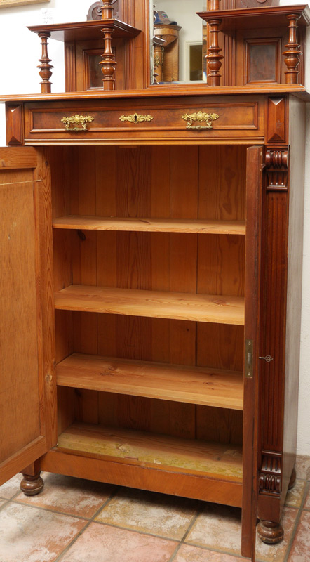 2 DOOR MAHOGANY TIERED TOP CABINET: Broken arch pediment with urn finial, back with central beveled glass mirror, carved panels, 2 tiers of open shelves. Base with singled full length drawer over 2 doors, 3 shelves, fluted stiles, on bun feet. Approx. 83'' h. x 38 1/2'' x 17 3/4''.