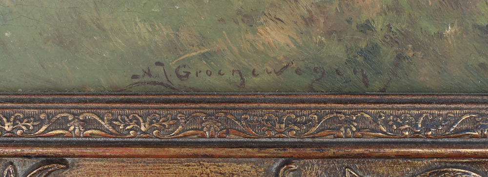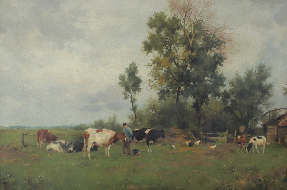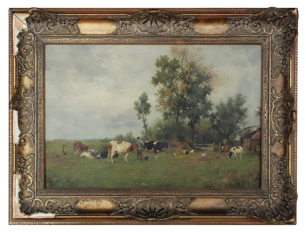 GROENEWEGEN, Adrianus Johanes, (Dutch, 1874-1963): Rural Scene with Dairy Farmer and Cows, Oil/Canvas, 16'' x 23.75'', signed lower right, carved and gilded gesso frame, 22.5'' x 30''.