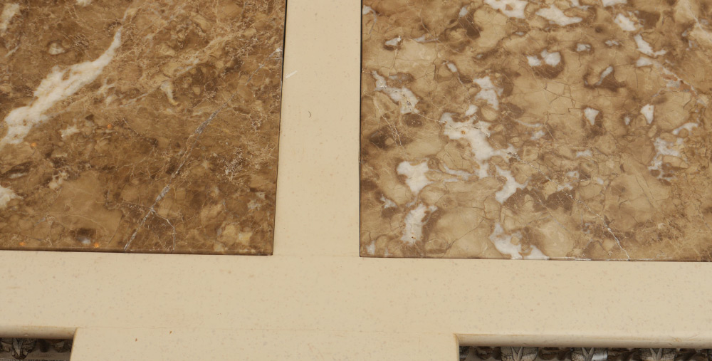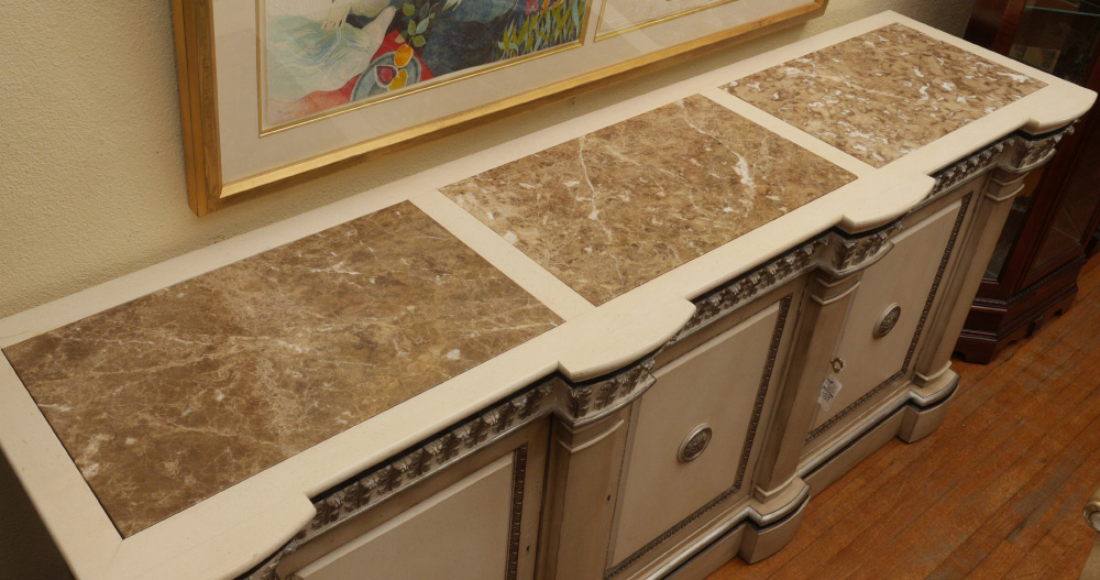 FERGUSON COPELAND NEO-CLASSICAL SIDEBOARD: Top with 3 inset marble panels, acanthus leaf border over column form stiles, 3 doors with applied medallion, internal drawers and shelf. Overall measures 37 3/4'' h. x 85'' x 22''.