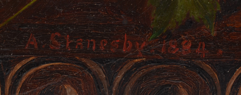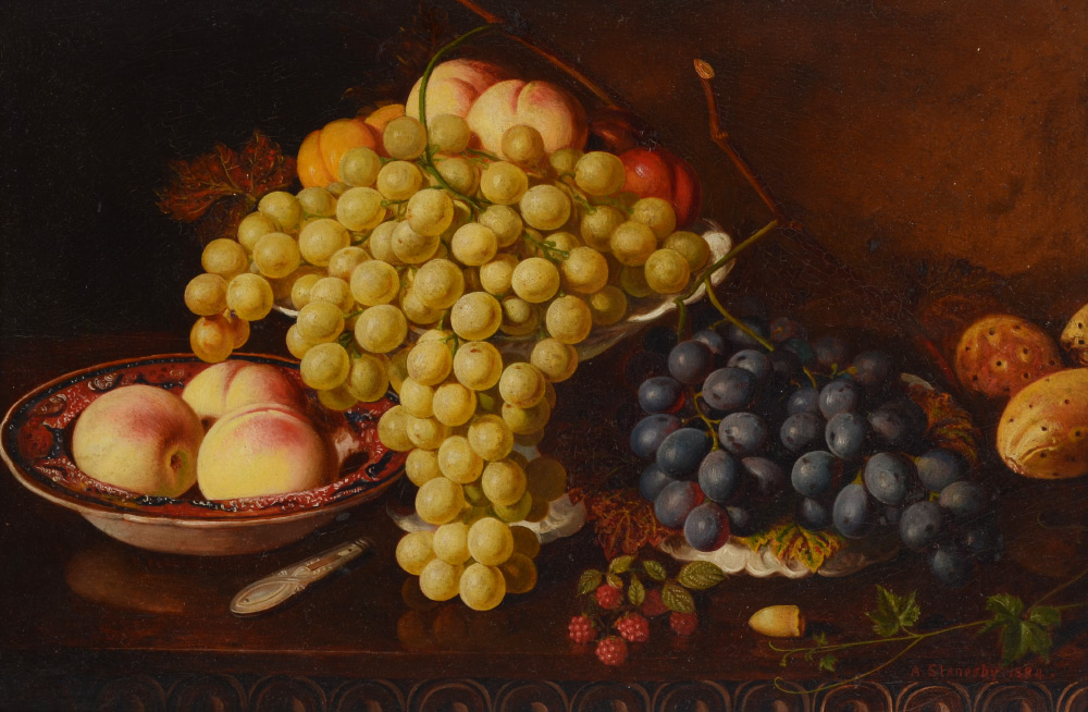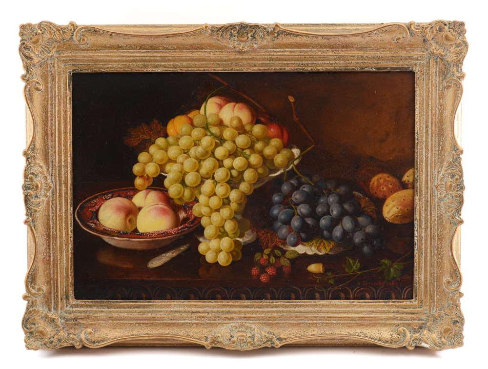 STANESBY, Alexander, (United Kingdom, 1832-1916): Still Life of Fruit (peaches, grapes, raspberries etc.), Oil/Board, 14.5'' x 20.75'', signed lower right and dated 1884, carved and gilded frame, 21'' x 26''.