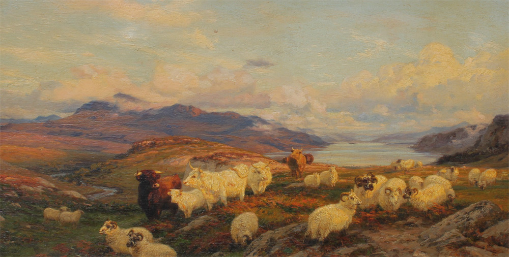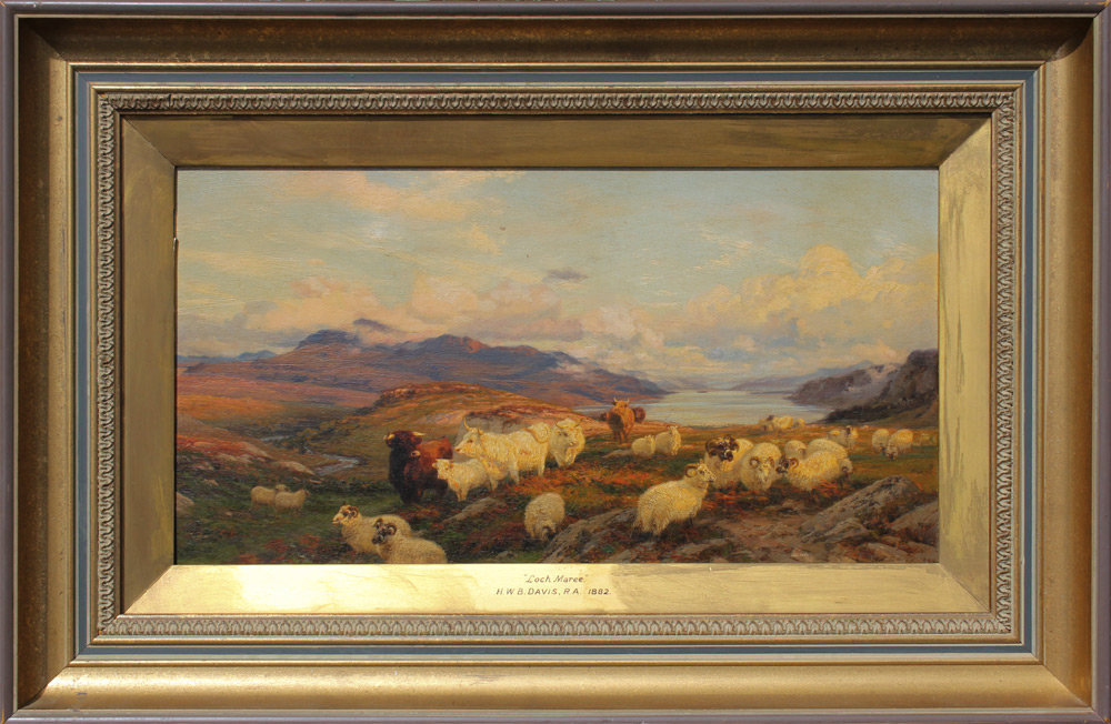 DAVIES, William Henry Banks, (British, 1833-1914): ''Loch Maree'', Highland Scene with Sheep and Cattle, Oil/Canvas, 9.25'' x 17.25'', signed lower right and dated 1882, framed 15'' x23''. In 2005 his painting ''Gathering the Flocks, Loch Maree'' fetched a hammer price of more than $100K at Sothebys.