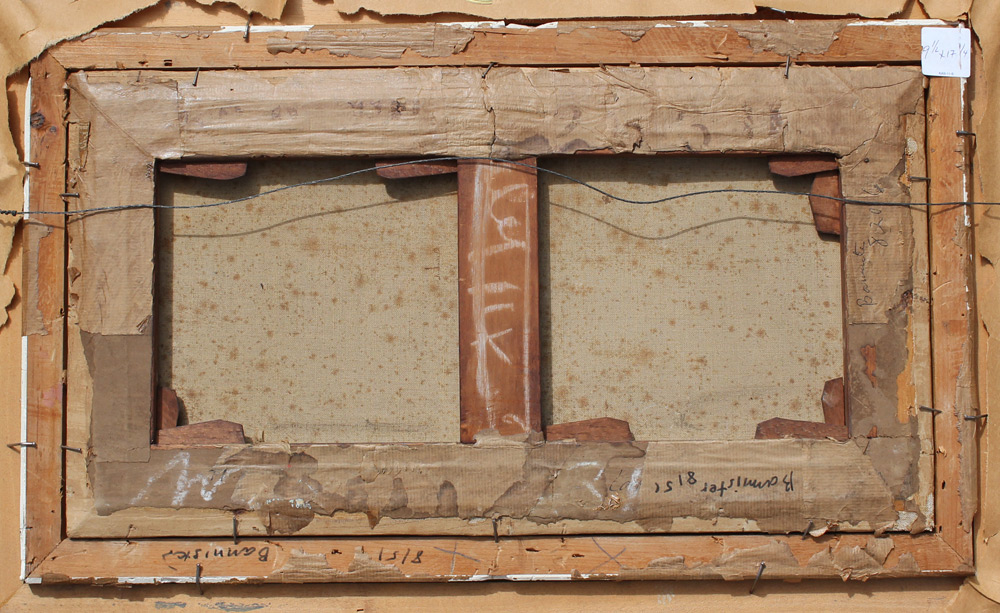 CONDITION: Frame is newer but shows restoration, scattered craquelure, indentation from back in the upper left quadrant, possible older reline, sold as is.