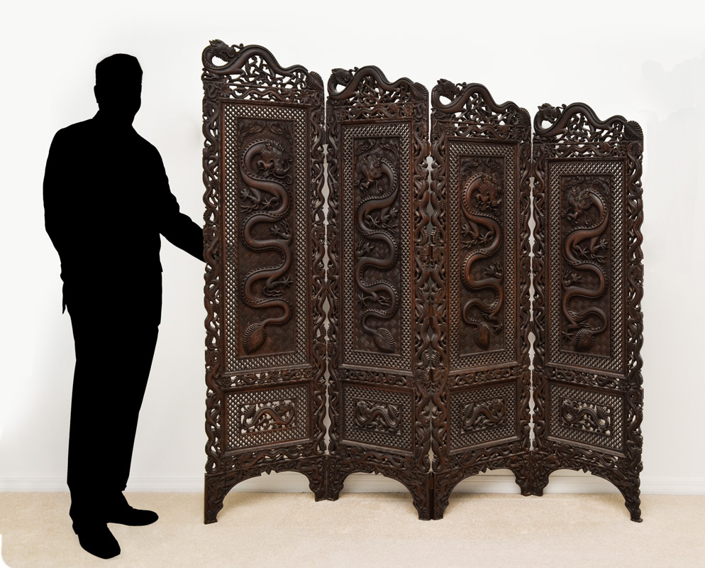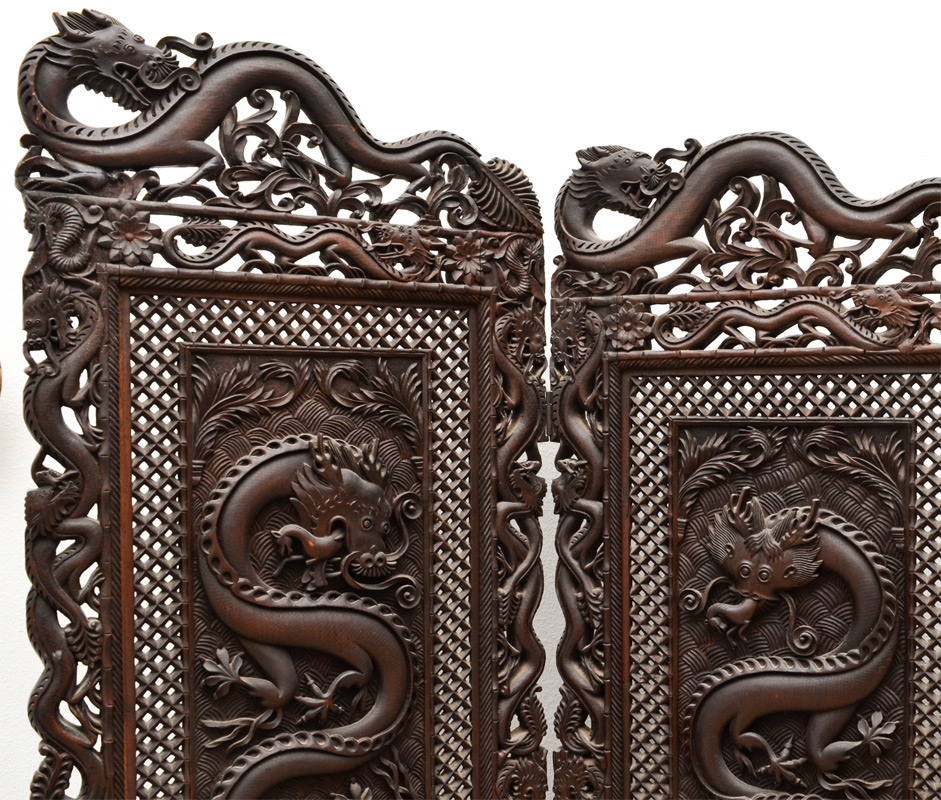 CHINESE 4 PANEL CARVED DRAGON FLOOR SCREEN: Profusely carved and pierced with dragon and foliate motifs all over on 4 graduating panels. The dragons in the center panels appear to be eating horses. Tallest panel measures 79'' x 21''.