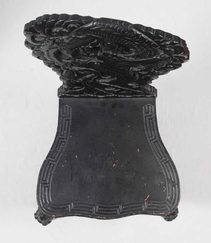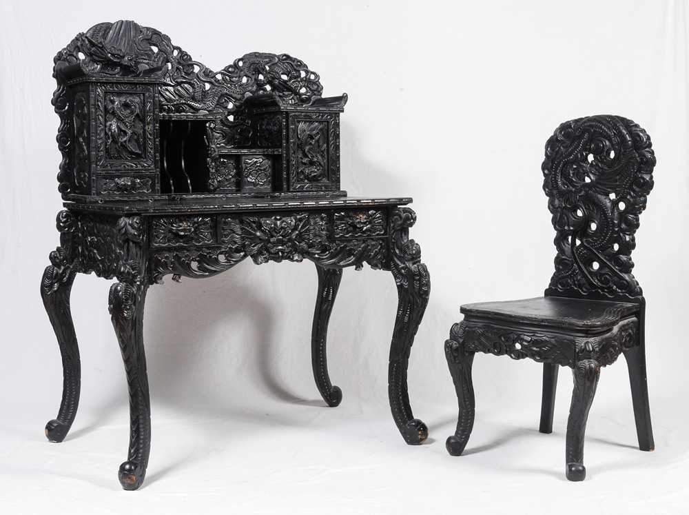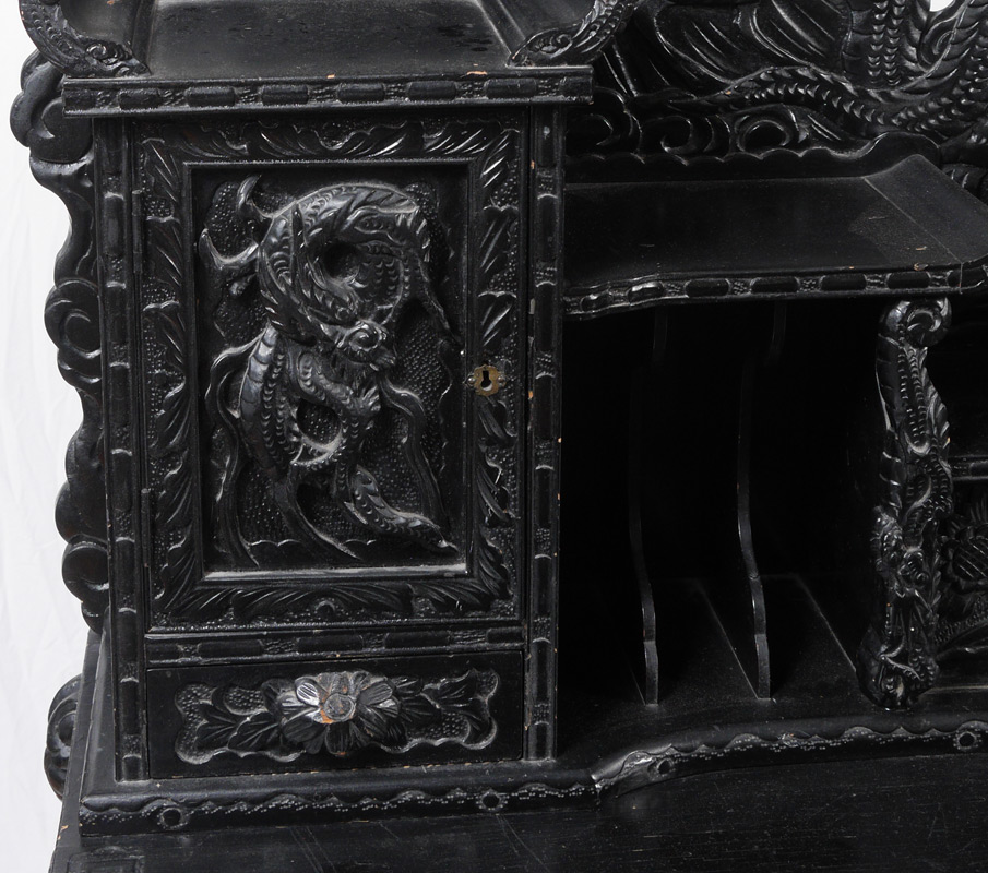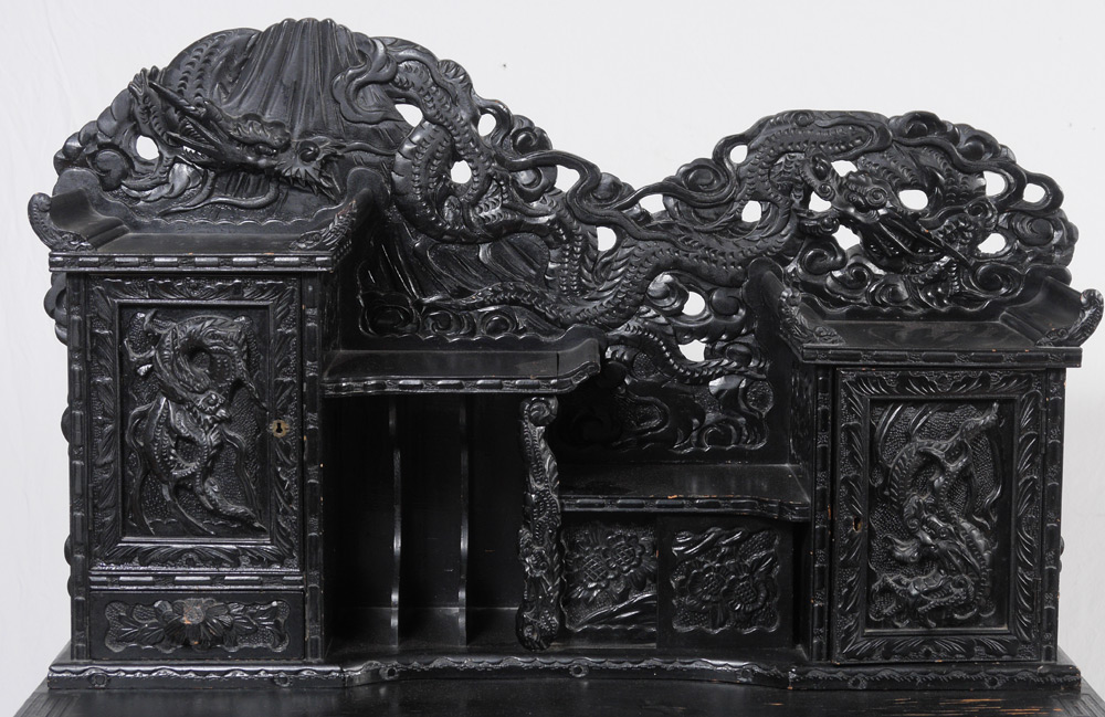 JAPANESE CARVED DRAGON MOTIF WRITING DESK AND CHAIR: Black lacquer desk profusely carved all over with dragon and floral motifs. Top with multi level shelves, 2 doors plus a sliding door, drawer and pigeon holes. Base with 2 small drawers, carved and shaped skirt and legs. Overall approx. 52'' h. x 40'' x 25 3/4''. Matching dragon motif chair measures 39 1/4'' h. x 19 1/2'' x 17 1/2''.
