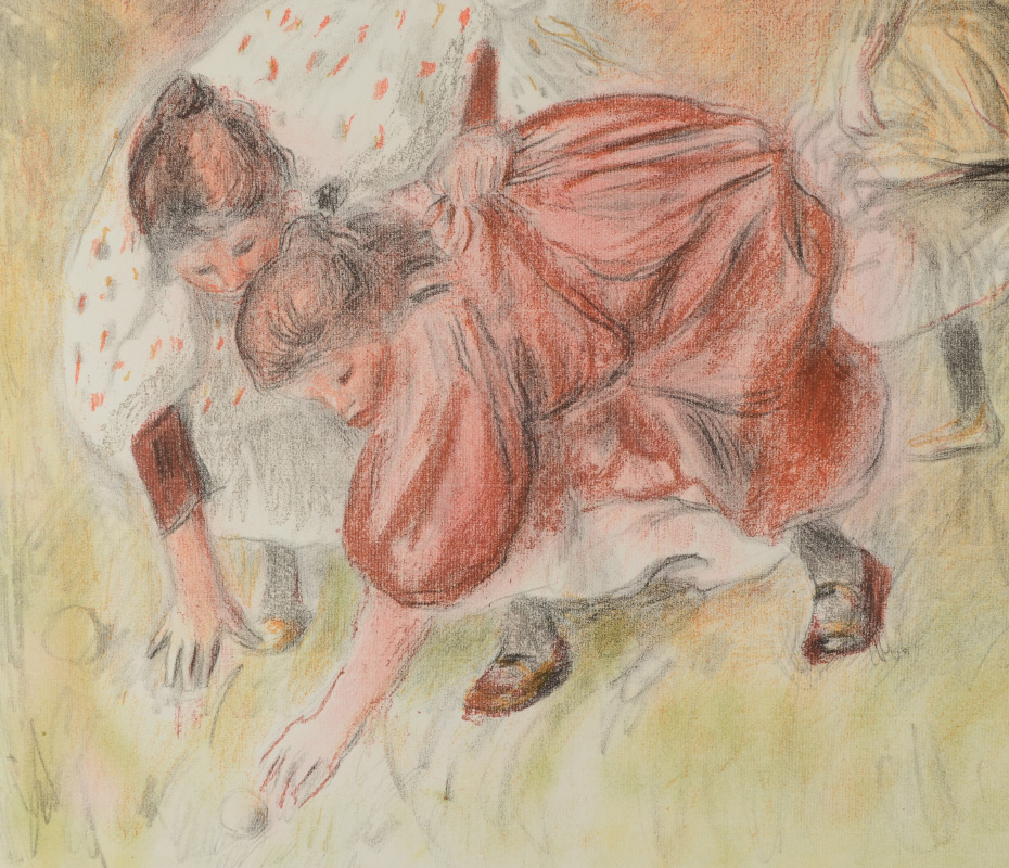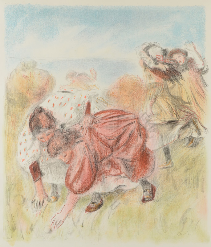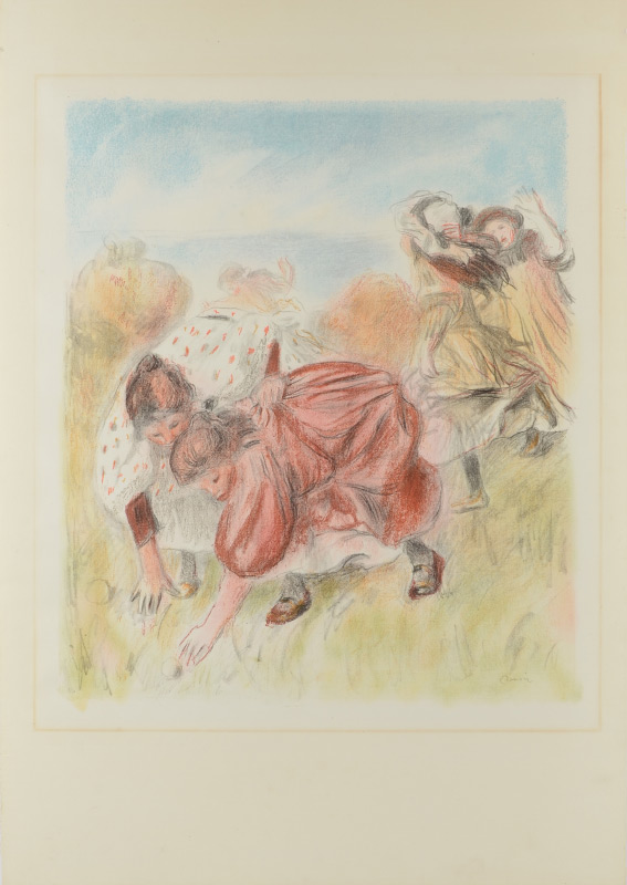 RENOIR, Pierre-Auguste, (French, 1841-1919): ''Enfants Jouant a la Balle'', Color Lithograph, 35.5'' x 24.5'' with margins, signed in the plate lower right, on Ingres d'Arches paper with MBM watermark on both vertical margins, framed, 38.5'' x 33.5''. Edition of 200 printed by Auguste Clot, published by Ambrose Vollard, one of only 4 color prints by Renoir. This is widely recognized as being his best print.