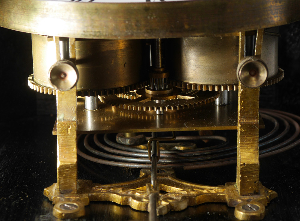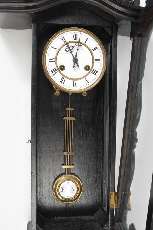 JUNGHANS ART NOUVEAU CASE WALL CLOCK: Removable pediment with applied decoration, art nouveau motif carved wood case. Porcelain dial marked Junghans, key wind time and strike movement. Overall measures 34 1/2'' h. x 15 1/2'' x 6''.