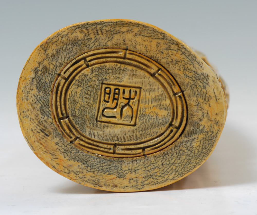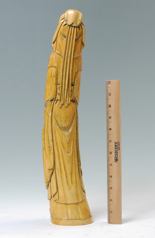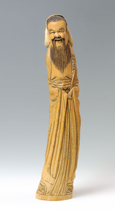 CARVED CHINESE MASTODON IVORY ELDER FIGURE: Figure of a man in robes with beard and hat, signed on base, overall measures 18'' h. x 4 1/2'' x 3''.
