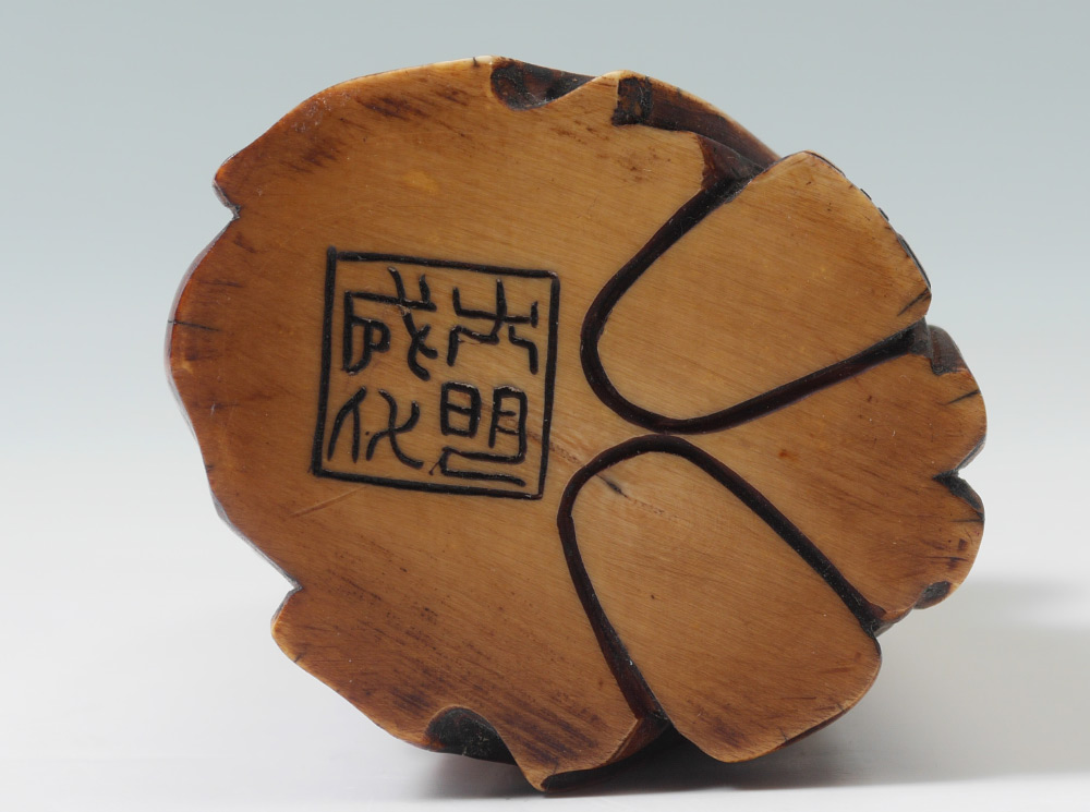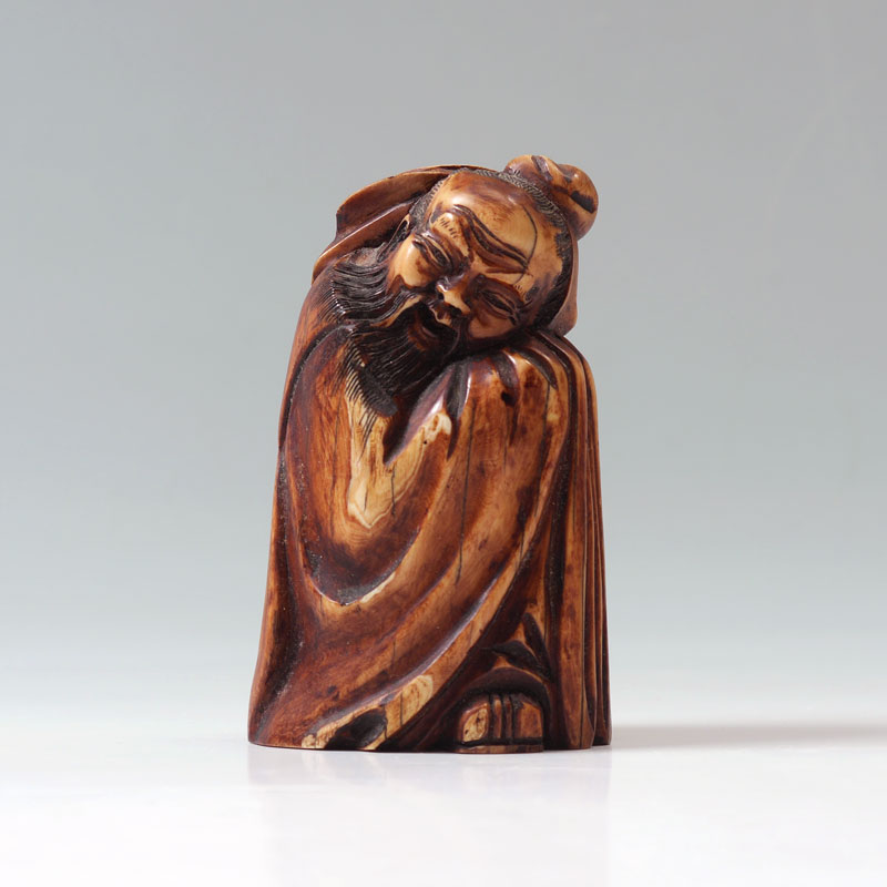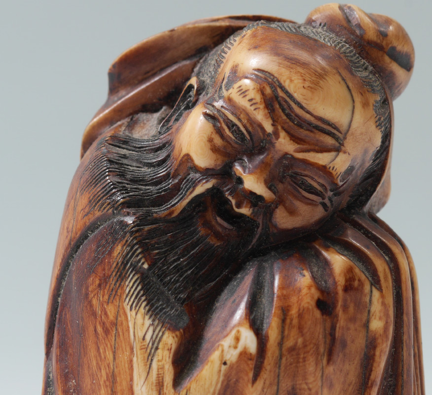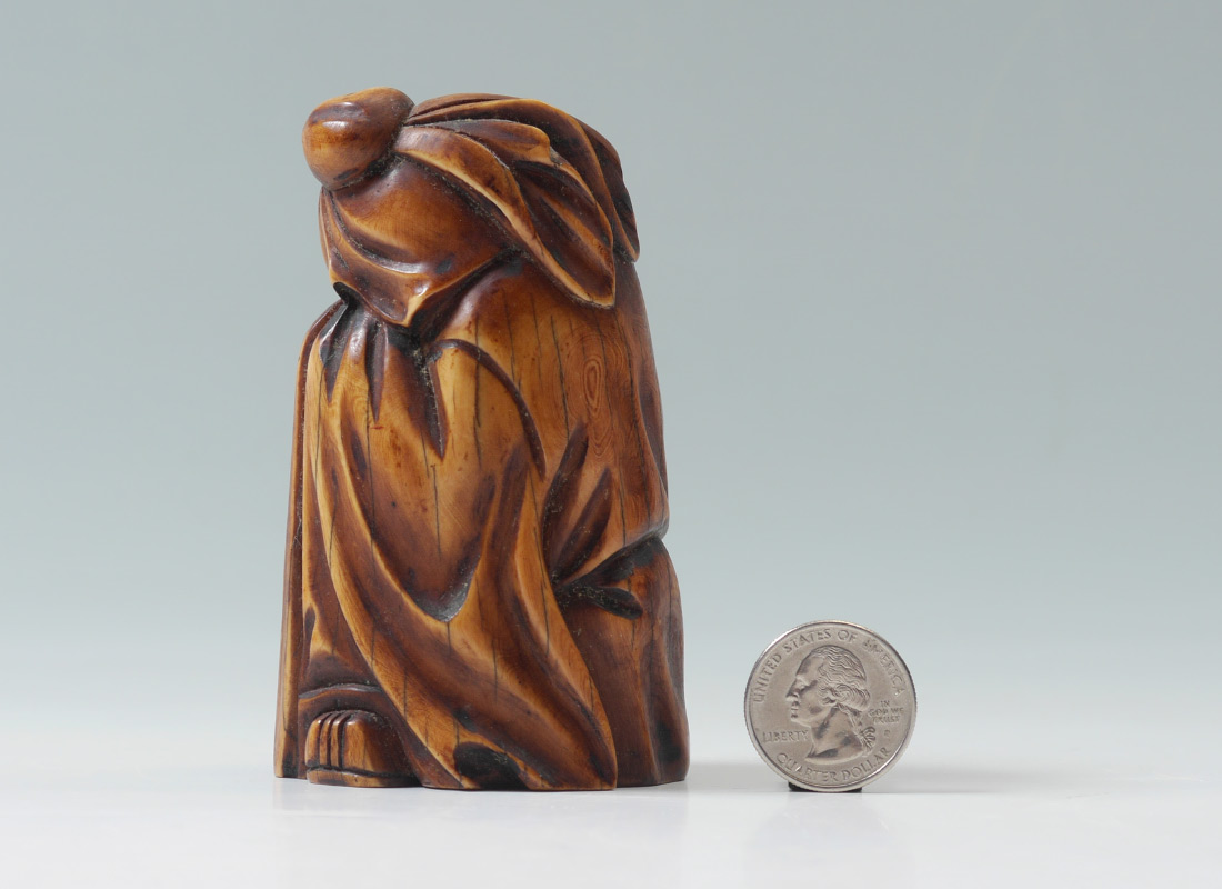 CARVED CHINESE MASTODON IVORY FIGURE: Figure of a hunched man in robes with beard, signed on base, overall measures 4'' h. x 2 3/8'' x 2''.
