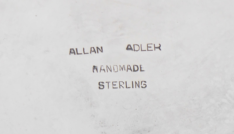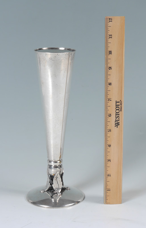 ALLAN ADLER STERLING VASE / CANDLEHOLDER: Mid 20th century by noted California silversmith Allan Adler, tapered vase with 4 leaf supports above foot. Vase converts to single light candleholder with insert, marked on base ''Allan Adler, Handmade, Sterling''. 10'' h. x 4''.