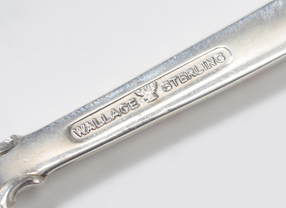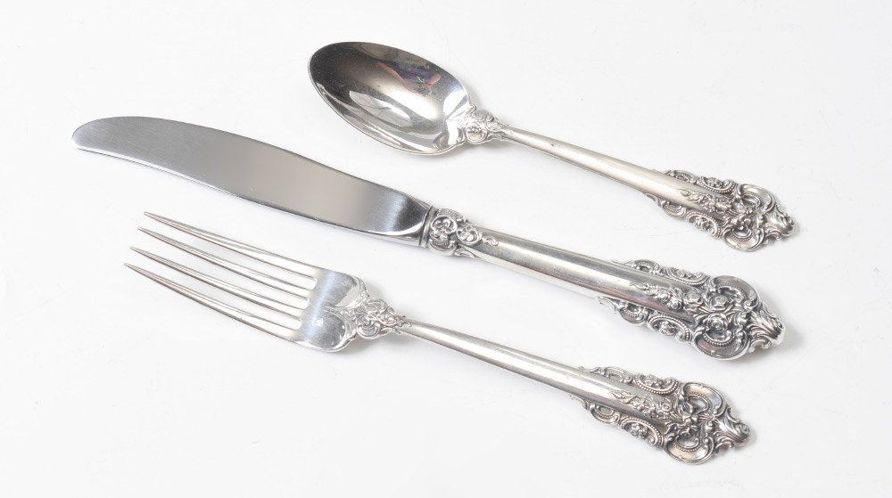 13 PIECE WALLACE GRAND BAROQUE STERLING FLATWARE: 17 pieces total, 13 in the Grand Baroque pattern by Wallace to include 3 forks (7 1/2), 3 salad forks (6 1/2''), 3 teaspoons (6 1/8''), 3 hollow knives (9''), hollow master butter (6 7/8''). Sold with sterling plate (9 1/2'' dia.), Towle sterling bowl (5 1/2'' dia.), sterling bon-bon spoon (4 1/4''), sterling handle brush (6 1/4''). Approx. 26.9 troy oz.