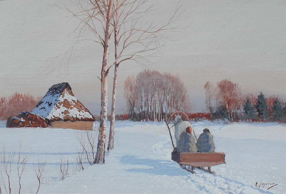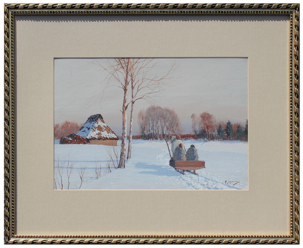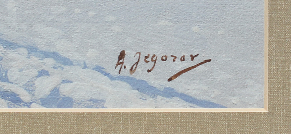 EGOROV, Andrei, (Russian, 1878-1954): Peaceful Winter Meadow Scene with Lone Horse Drawn Sleigh Approaching a Domicile, Gouache, sight size 11.5'' x 18'', signed lower right, framed, 21.5'' x 27.25''. Egorov's work has been sold at auction for more than $20K.