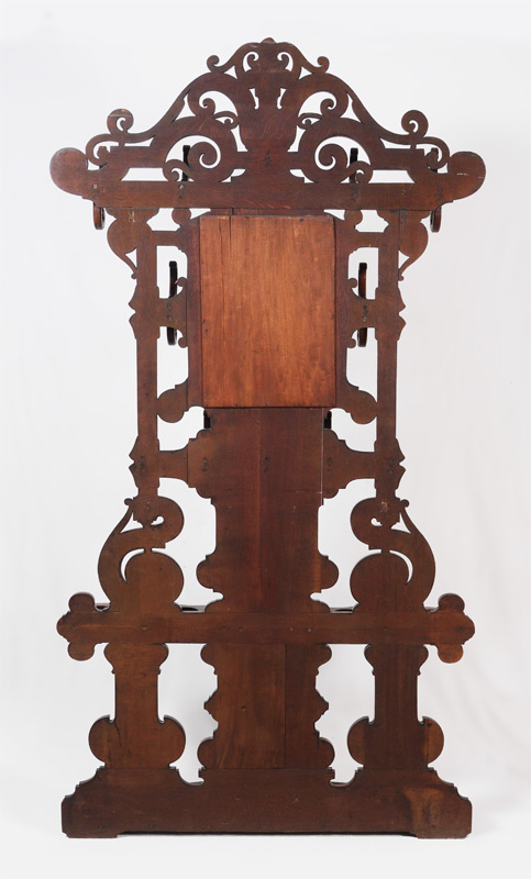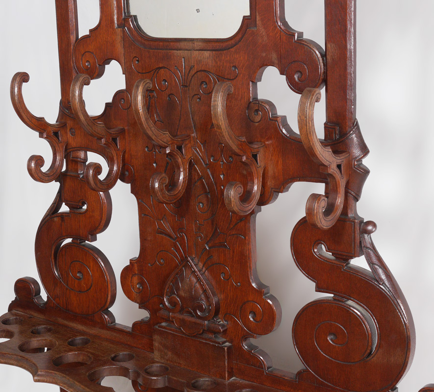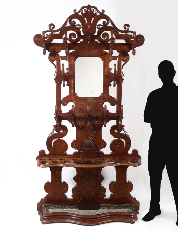 WALNUT VICTORIAN HALL TREE: Open work scroll crest and body, 12 wood coat hooks, central mirror, carved decoration, open shelf with holes for umbrellas and walking sticks. Lower metal insert, overall measures 90'' h. x 48'' x 11''.