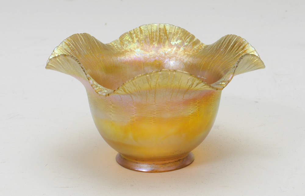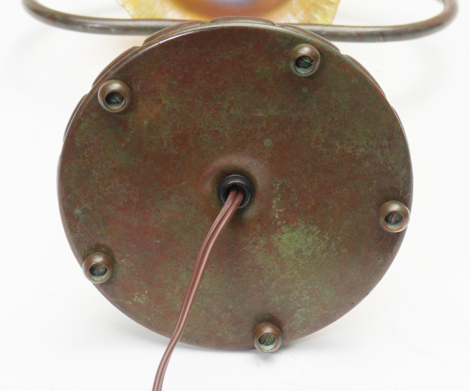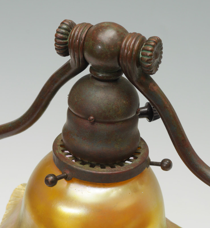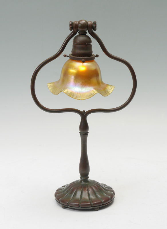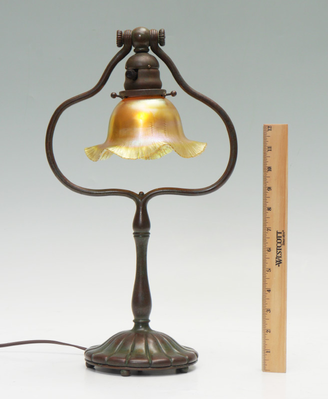 TIFFANY STYLE DESK LAMP WITH QUEZAL SHADE: Bronzed finish lamp frame similar to the Tiffany Studios #424 base, unsigned. Signed Quezal floriform iridescent shade, 3 3/8'' h. x 6 1/8'', fitter rim 2 1/4''.
