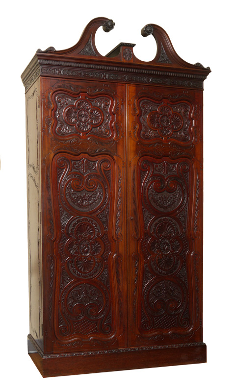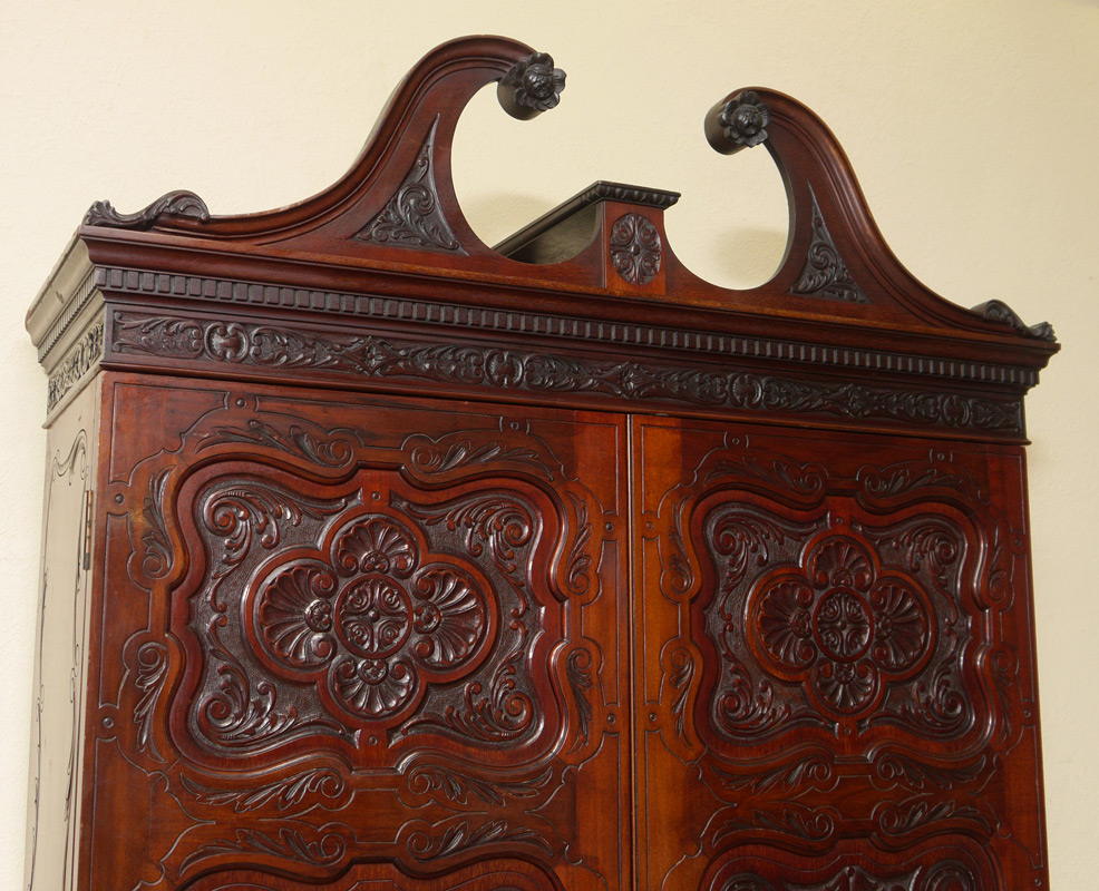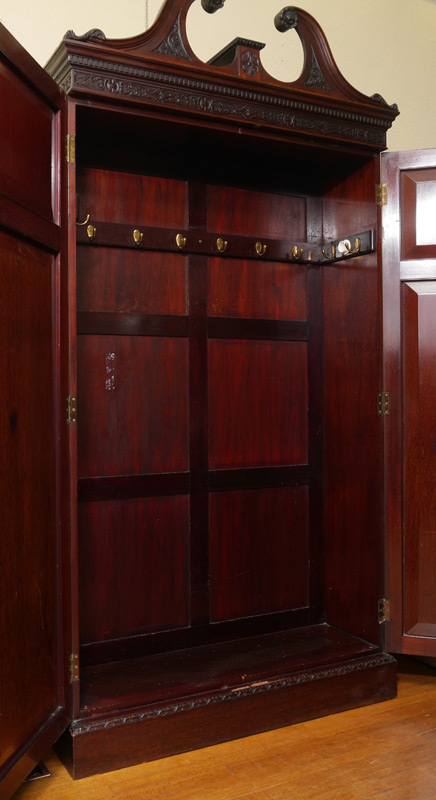 RICHLY CARVED VICTORIAN ARMOIRE: Broken arch swan neck pediment with carved and applied decoration. Dentil molding over carved trim, 2 over the top carved doors with panels of stylized floral motifs, interior with coat hooks. Approx. 82'' h. x 45'' x 14 1/4''.