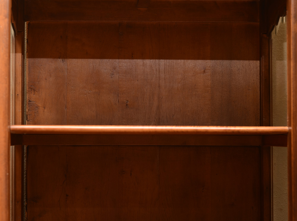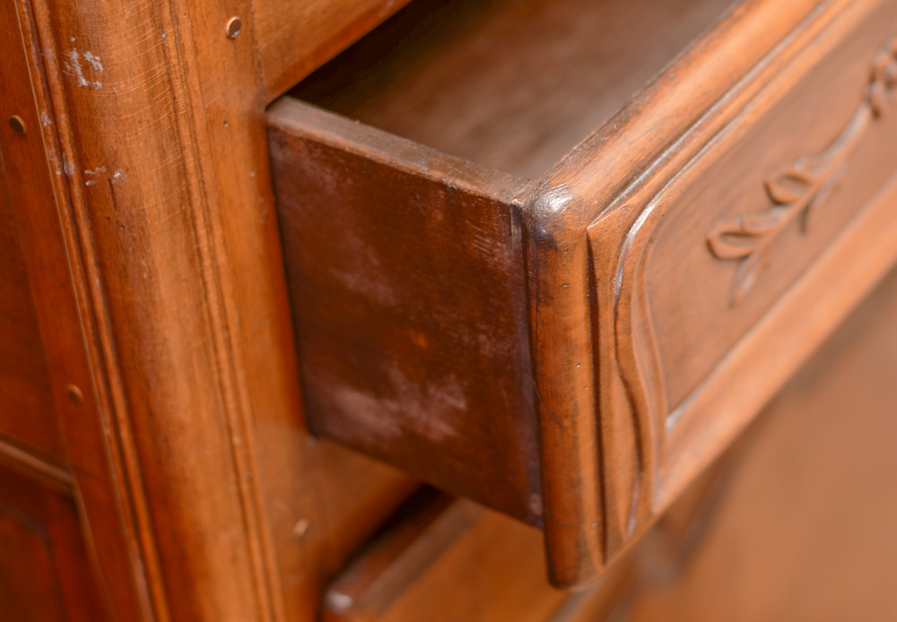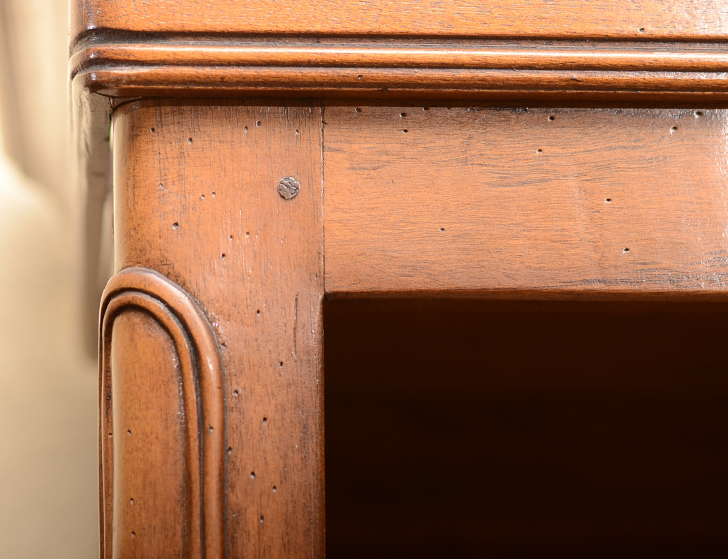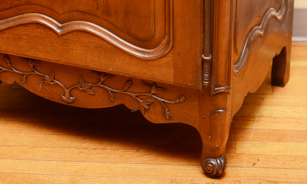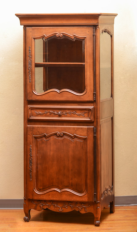 COUNTRY FRENCH DISPLAY CABINET: Carved and shaped top beveled glass door and side windows, single drawer with carved floral panel over single blind door with shelf. Carved and shaped skirt and feet, overall measures 76 1/2'' h. x 33'' x 22 1/2''.