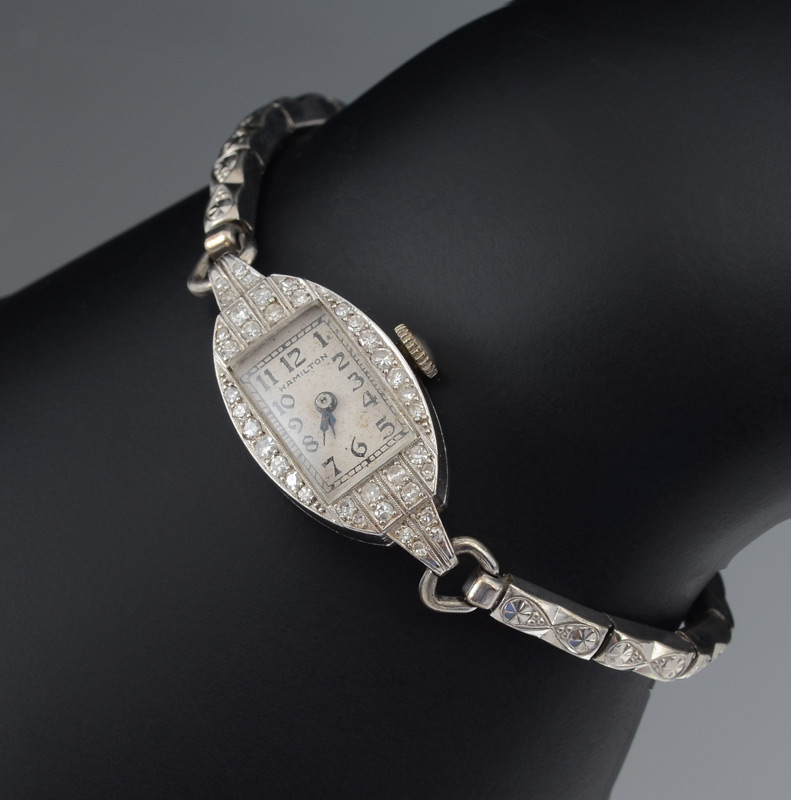 HAMILTON PLATINUM DIAMOND DECO WRISTWATCH: Platinum Hamilton wristwatch with 38 single cut diamonds totaling approx. .50 Ct. The diamonds are bead set. Non gold expansion band. Mechanical movement is not running. Plat weight: 8.0 grams approx.