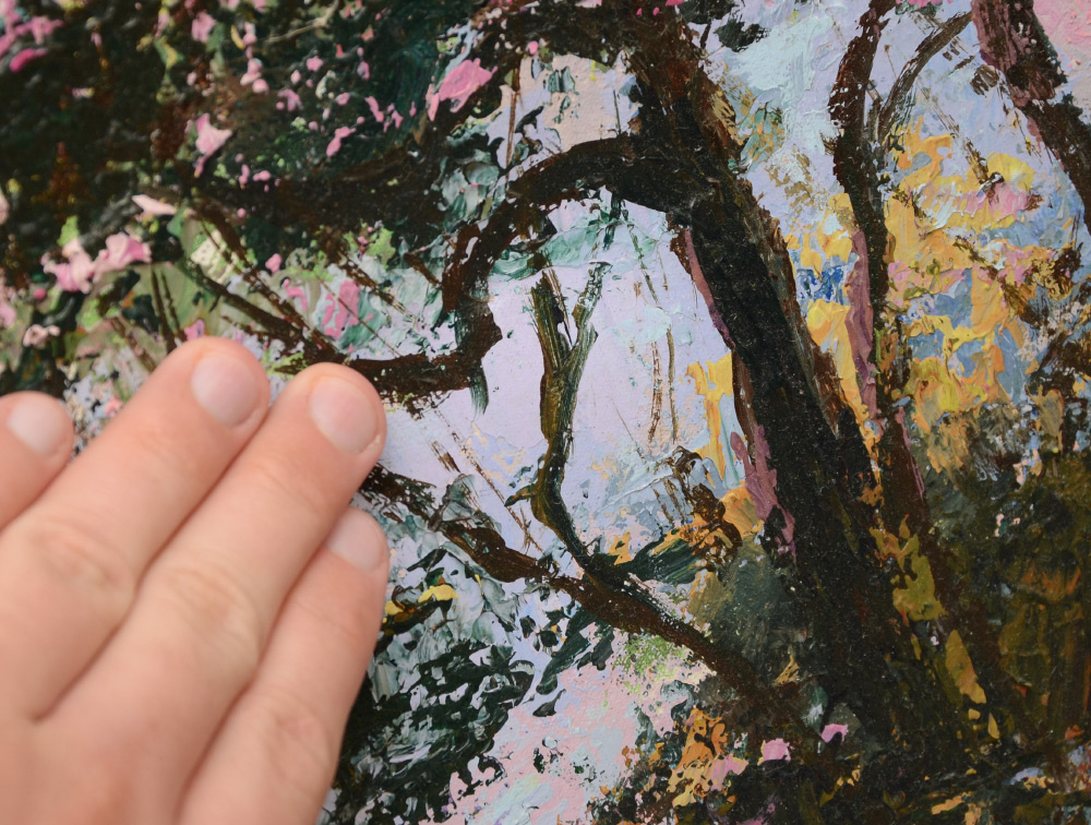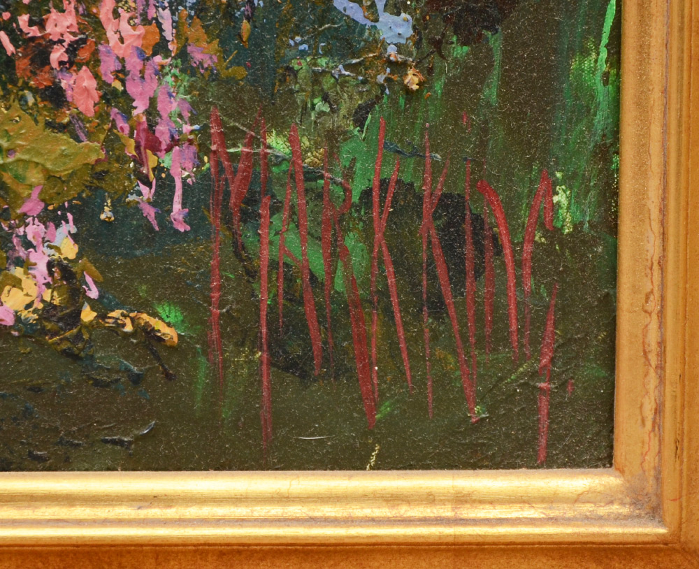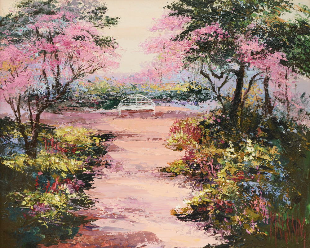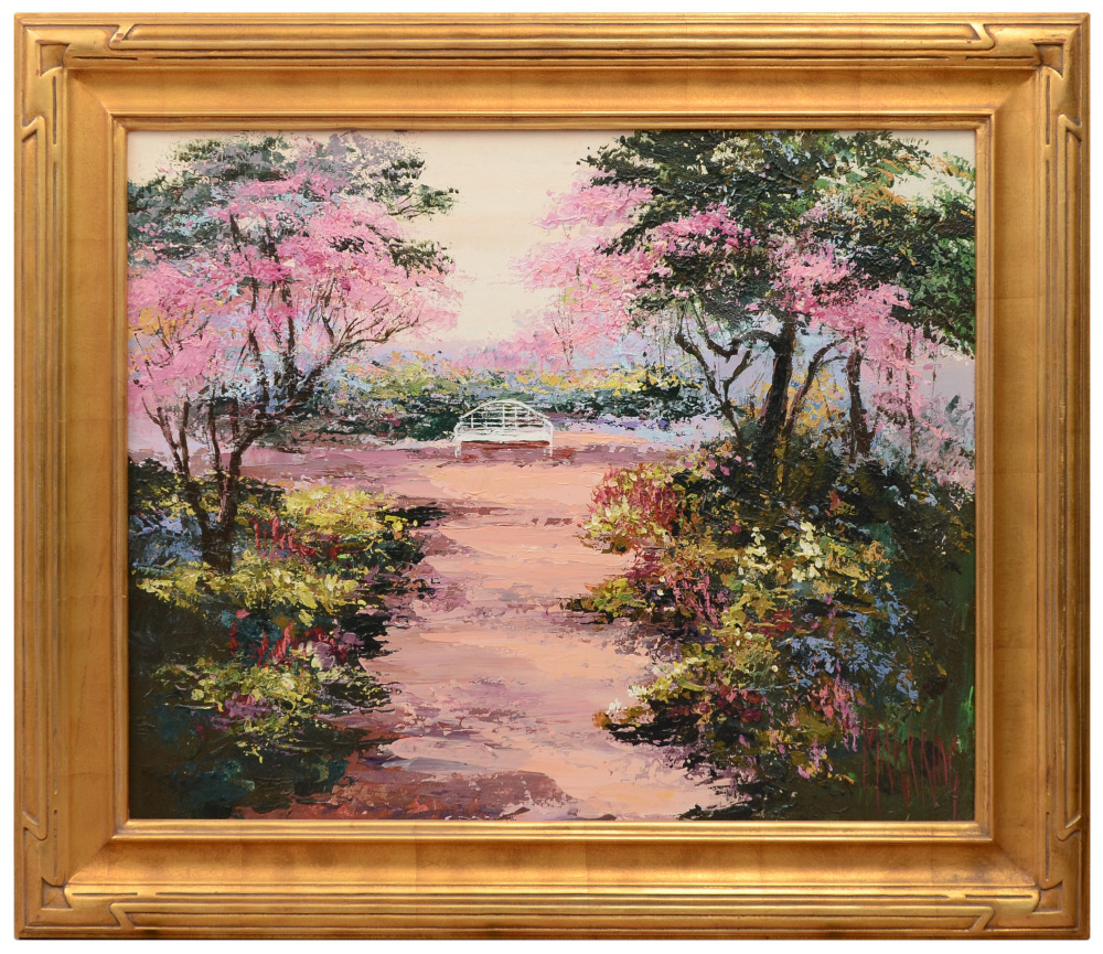 KING, Mark, (American, 1931-): Cherry Blossom Path, O/C, 23'' x 30'', signed, fine gilded and carved Impressionist frame, 32'' x 38''.