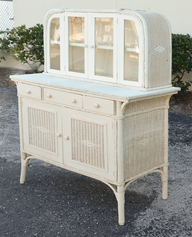 UNUSUAL WHITE WICKER SIDEBOARD: Top with arched sides, 2 glass doors with single interior shelf. Wood top base with 4 drawers over 2 doors, overall measures 59 1/2'' h. x 49'' x 21 3/4''.