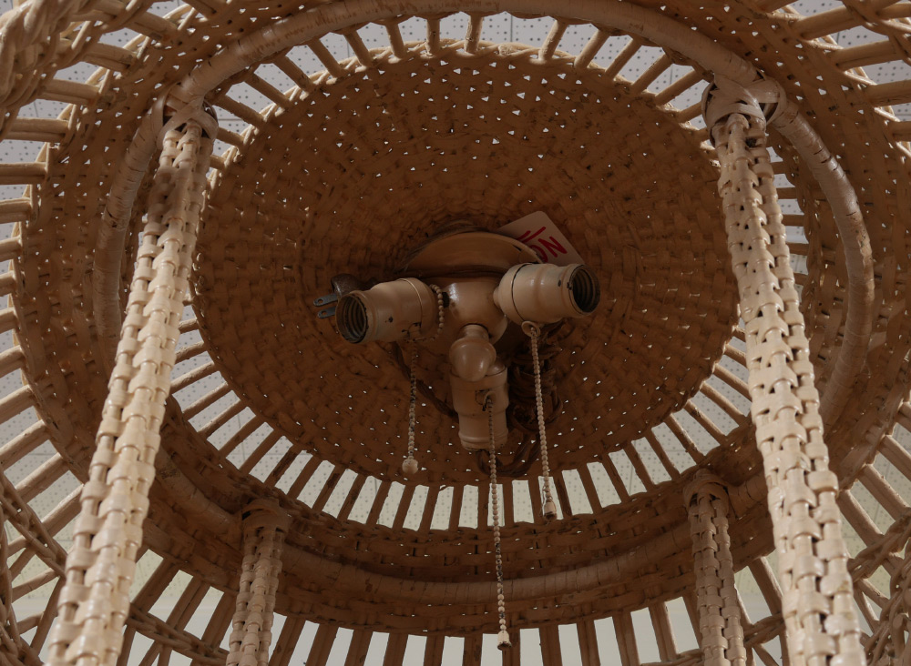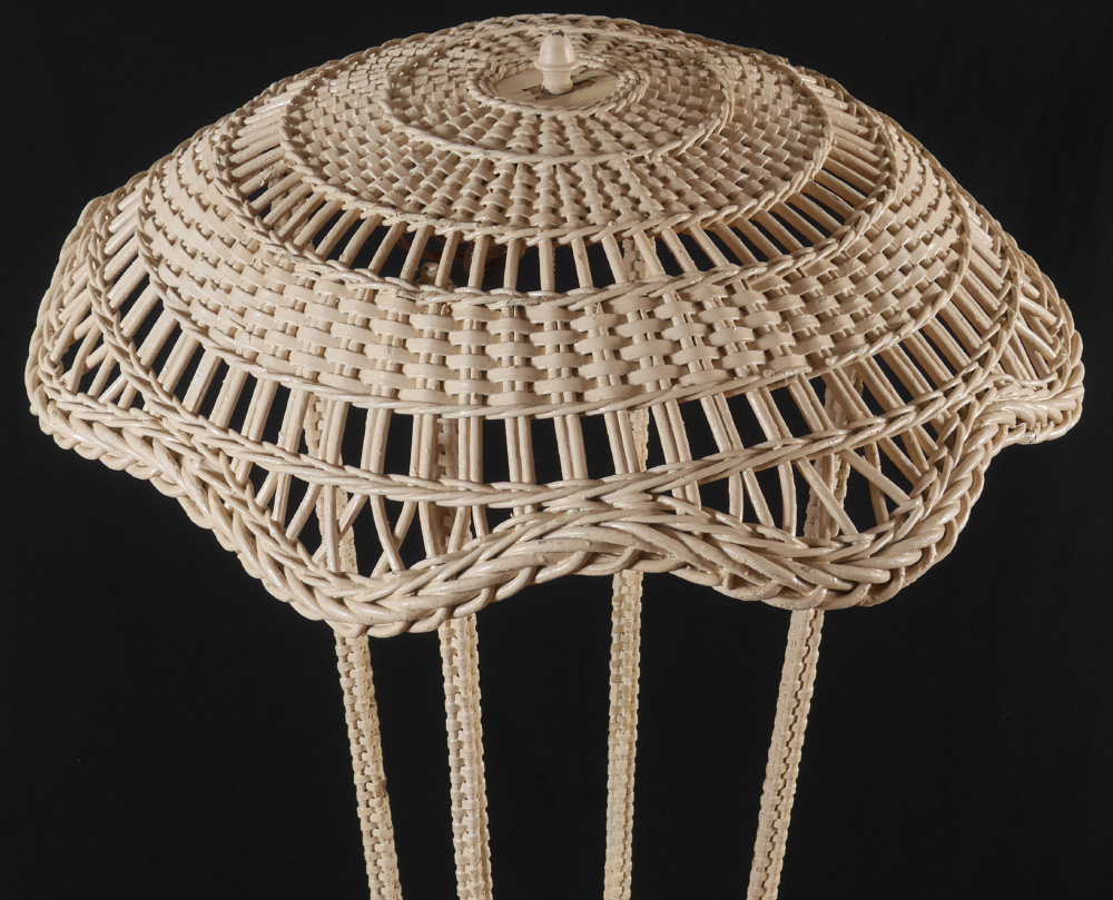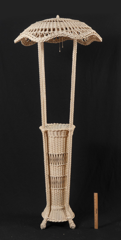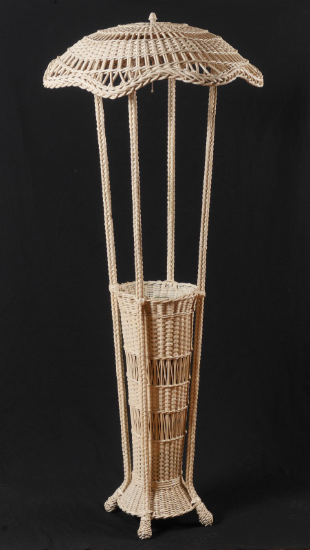 WICKER FLOOR LAMP & UMBRELLA STAND: Parasol style top with 4 triple fixture socket, 4 supports, base with metal insert for umbrellas & canes, on 4 feet. Overall measures 70'' h. x 29 1/2'' dia.