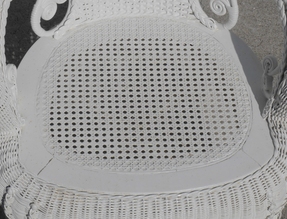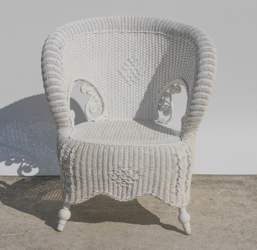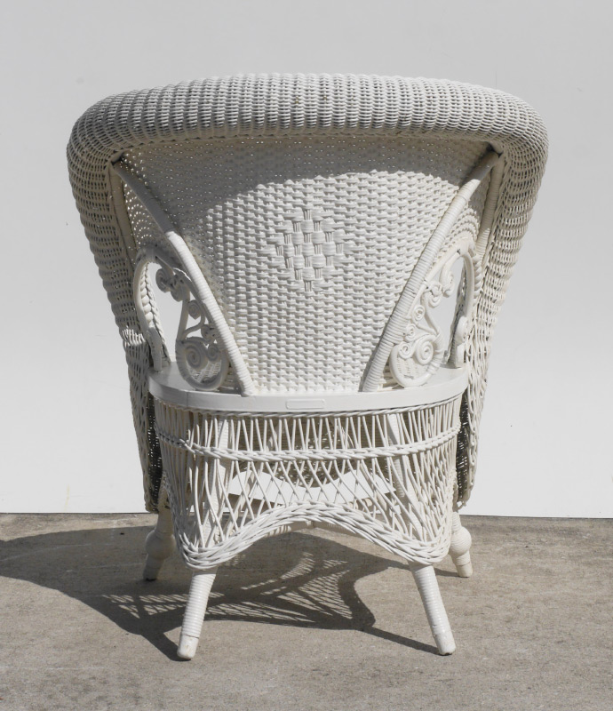 WHITE WICKER ROLLED ARM CHAIR: Barrel shape back, rolled arms, shaped skirt, 32 1/2'' h. x 28 1/2'' x 25''.