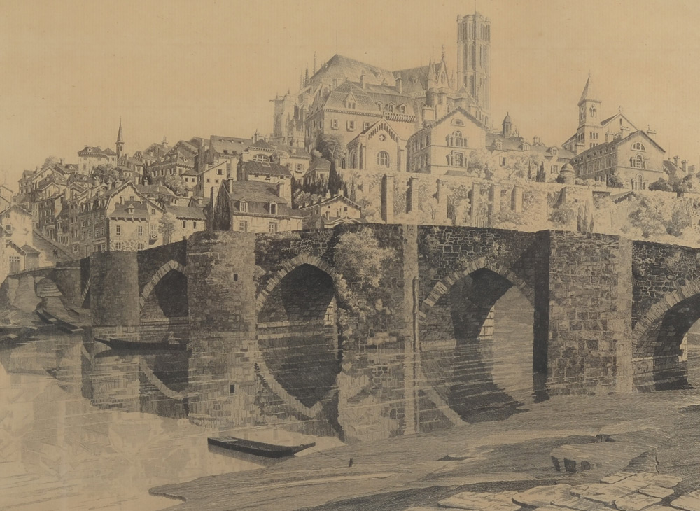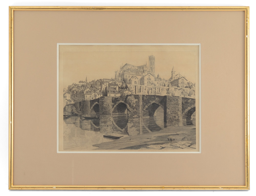 ARMS, John Taylor, (American, 1887-1953): Etching of The City from Canal, sight size 10.5'' x 14.25'', pencil signed lower right, framed 18.5'' x 24.5''. CONDITION: Overall minor toning, several spots of foxing, not examined out of frame, sold as is.