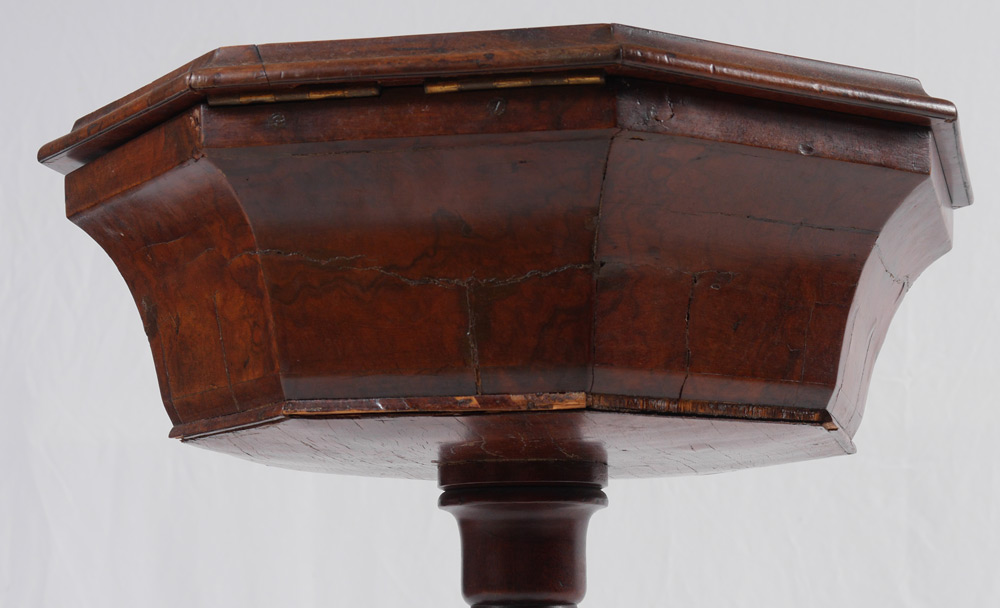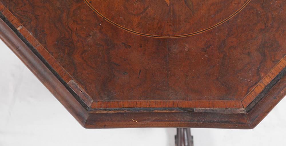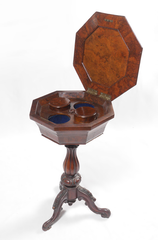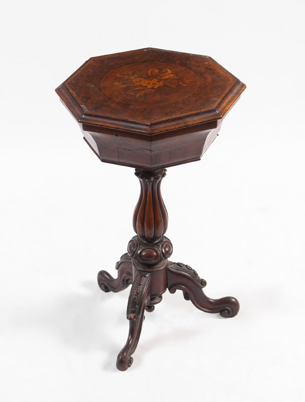 VICTORIAN MARQUETRY INLAID SEWING STAND: Octagonal hinged top with floral motif inlaid center medallion. Interior with 2 round boxes and 2 holes ready for inserts. Fluted and carved base with splayed legs. Measures 29'' h. x 17 3/4''.