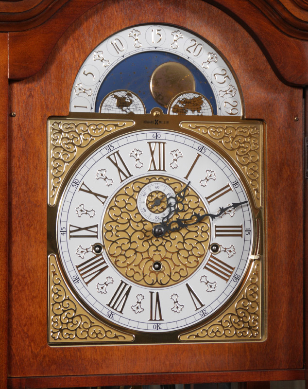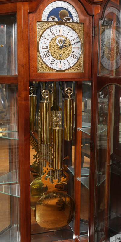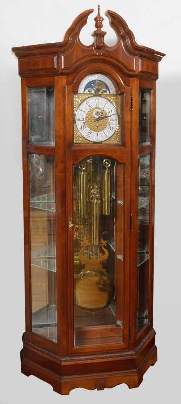 HOWARD MILLER CURIO GRANDFATHER CLOCK: Mahogany case, broken arch pediment with center spire finial. Illuminated mirrored back interior with display shelves, mixed metal dial with moonphase and Roman numerals. Triple weight triple time and strike movement. Overall measures 84 1/2'' h. x 35'' x 13''.