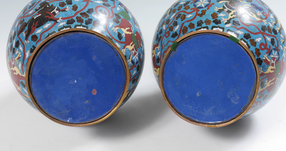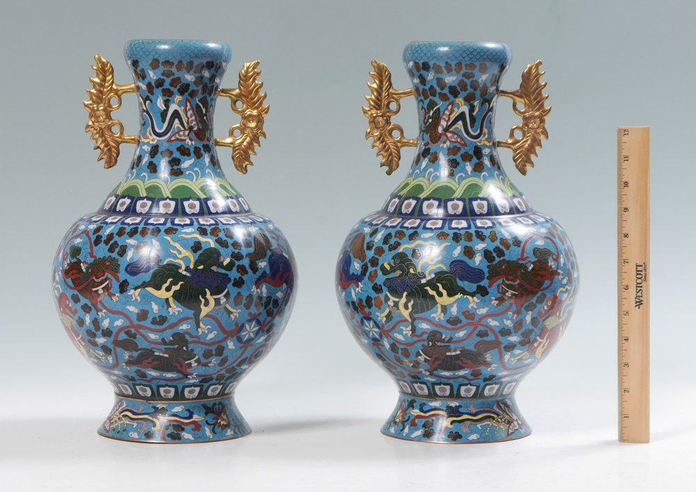 PAIR CHINESE CLOISONNE VASE WITH FOO DOGS: Bulbous form body with frolicking foo dogs in sky with clouds, applied floriform brass handles. Measures 15 1/2'' h. x 9 1/2''.