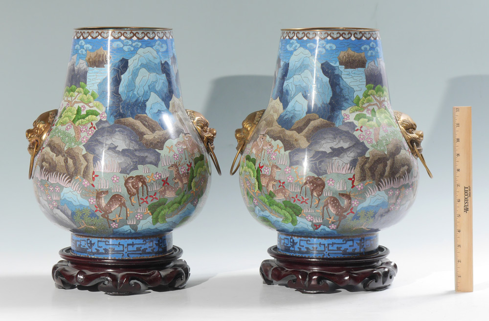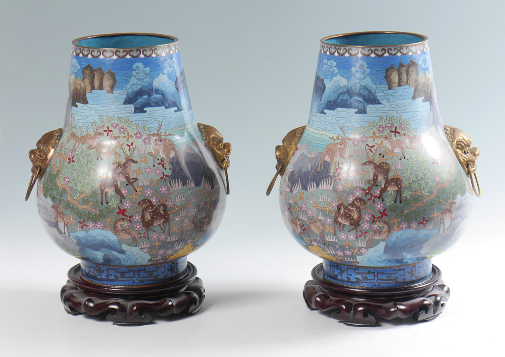 PAIR LARGE BULBOUS CLOISONNE VASES: Each with deer in landscape cloisonne motifs, applied masqueron handles, no visible marks. 15 1/4'' h. x 13 1/2''. Sold with carved wood stands, 2 1/2 h. x 9 1/2''.